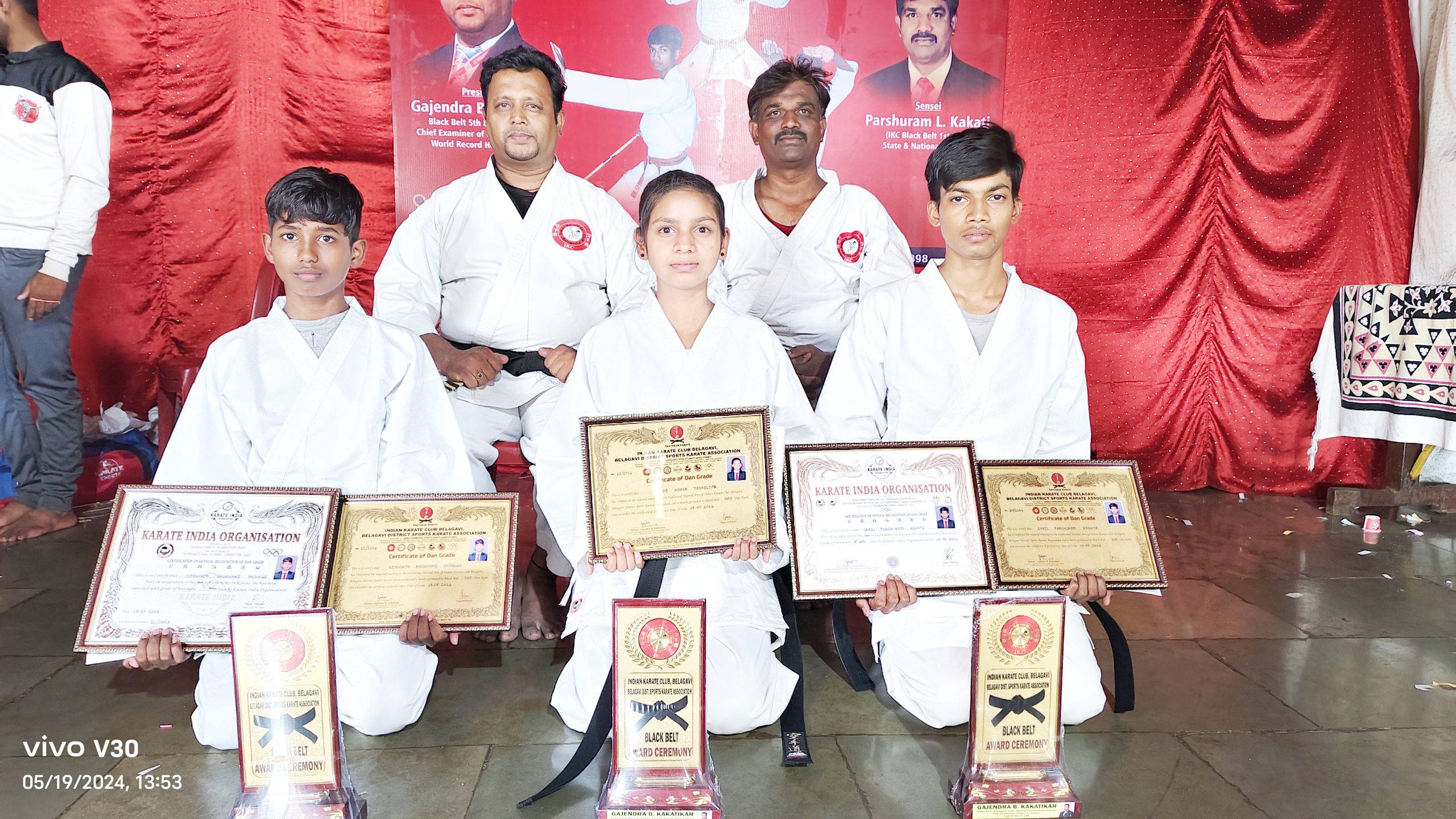 बेळगाव : इंडियन कराटे क्लब व बेळगाव जिल्हा स्पोर्ट्स कराटे असोसिएशनच्या वतीने घाण्यात आलेल्या विविध कलरच्या बेल्ट परिक्षत इंडियन कराटे 3 कराटेपटूनी ब्लॅक बेल्ट पटकाविला. मुचंडी येथील औदुंबर मंगल कार्यालय येथे कराटेची बेल्ट परीक्षा पार पडली. या परीक्षेत एकूण 75 कलर बेल्ट कराटेपटू सहभागी झाले होते. तर टॉप तीन ब्लॅकबेल्ट विद्यार्थी साहिल काकती, सिध्दार्थ मोदगे आणि रोहिणी ताशिलदार या तिन्ही विद्यार्थ्यांनी राष्ट्रीय आणि आंतरराष्ट्रीय कराटे स्पर्धेत सहभागी होऊन विविध ठिकाणी पदके मिळविली. विद्यार्थ्यांना इंडियन कराटे क्लब व बेळगाव जिल्हा स्पोर्ट्स कराटे असोसिएशनच्या, व प्रमुख पाहुणे संजु कुमार हुलकाय, लेफ्टनंट कर्नल तलुनवीरसिंग ढिल्लोन, अमित कोना, शशांक मिराशी, मुख्याध्यापिका ज्योती सुर्यवंशी, लक्ष्मण बुद्री, चनगौडा बरगावी, कराटे मास्टर गजेंद् काकतीकर यांच्या हस्ते ब्लॅकबेल्ट, प्रमाणपत्र आणि स्मृतीचिन्ह देऊन गौरविण्यात आले. यावेळी त्यांच्या पालकांना सुद्धा शाल, श्रीफळ व पुष्पगुच्छ देऊन सन्मानित करण्यात आले. वरील दोन्ही ब्लॅकबेल्ट विद्यार्थ्यांना कराटे प्रशिक्षक परशुराम काकती यांचे प्रशिक्षण लाभत आहे. तर ही परिक्षा यशस्वी करण्यासाठी इंडियन कराटे क्लबच्या लेडी चीफ इंस्ट्रक्टर हेमलता ग. काकतीकर व प्रशिक्षक विठ्ठल भोजगार, प्रभाकर किल्लेकर,विजय सुतार, निलेश गुरखा, हरीष सोनार,विनायक दंडकर, ,परशराम नेकनार, लक्ष्मीकांत आनंदाचे,कृष्णा जाधव , वचना देसाई, रितु चौगुले, संजु गस्ती, आदित्य तळवार, लक्ष्मण कुंभार, पार्थ चौगुले पाटील, किरण गडकर, सुमित काकती, जयकुमार मिश्रा आणि सक्षम हंडे यांनी विशेष परिश्रम घेतले.