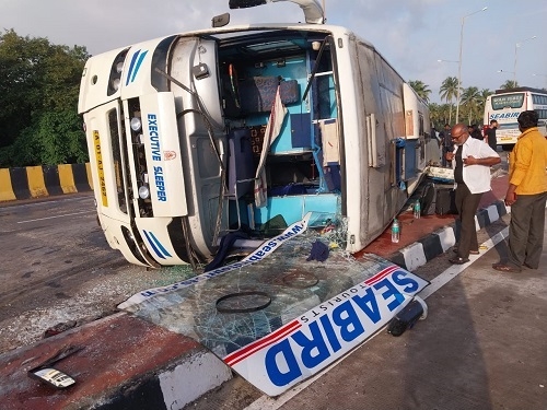 पोलीस सूत्रांकडून मिळालेल्या माहितीनुसार गोवा ते बेंगळूर आणि बेंगळूर गोवा असा नियमित प्रवास करणारी सी बर्ड कंपनीची आंतरराज्य प्रवासी बस असून ती सकाळी बेंगळूरहून गोव्यात दाखल झाली होती. मडगावला काही प्रवासी उतरल्यावर राहिलेल्या 18 प्रवाशांना घेऊन ती पणजीकडे शेवटच्या थांब्यावर जात होती. मात्र, कुठ्ठाळीतील नवीन झुआरी पूल ओलांडल्यानंतर सकाळी साडेसातच्या सुमारास आगशीतील महामार्गावर चालकाचे बसवरील नियंत्रण गेले. त्यामुळे ही बस रस्त्यावरच कलंडली. या अपघातात सात प्रवासी जखमी झाले. इतर सर्व प्रवासी सुखरूप आहेत. 108 ऊग्णवाहिकांमधून जखमींना गोमेकॉमध्ये दाखल करण्यात आले. आगशी पोलिसांनी या अपघाताचा पंचनामा केलेला असून चालकाला पोलिसांनी ताब्यात घेतले आहे. पोलीस अधिक चौकशी करीत आहेत.