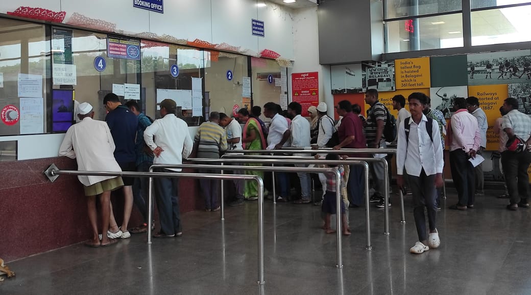 बेळगाव रेल्वेस्थानकाच्या मुख्य प्रवेशद्वारानजीक असणाऱ्या बुकिंग काऊंटरवर सोमवारी सकाळपासूनच प्रवाशांची गर्दी झाली होती. आपण कोठे प्रवास करणार आहोत, यासाठीचा अर्ज भरून तो बुकिंग काऊंटरवर आधारकार्ड क्रमांकासह द्यावा लागतो. त्यानंतरच प्रवाशांचे बुकिंग करून घेतले जाते. अॅडव्हान्स बुकिंग करण्यासाठी काऊंटरवर रांगा लागत आहेत. ज्या प्रवाशांना ऑनलाईन बुकिंग करणे शक्य नसते, ते काऊंटरवर जाऊन बुकिंग करतात.