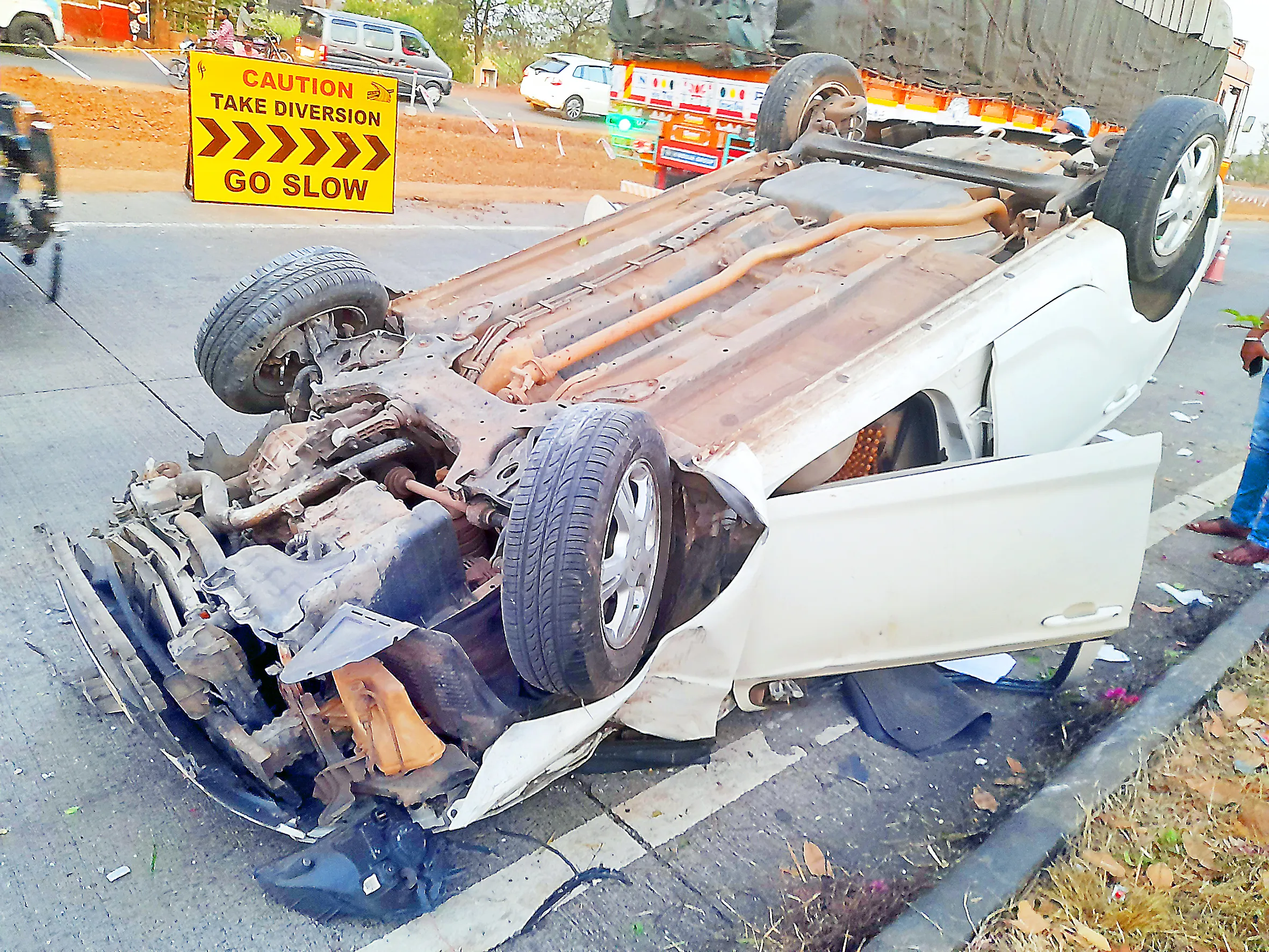 याबाबत घटनास्थळावरून समजलेले माहिती अशी, कार क्रमांक एमएच 13 एझेड 6226 ही गडहिंग्लजहून कागलच्या दिशेने जात होती. दरम्यान, 30 छाप विडी कारखान्यानजीक कार आल्यानंतर अज्ञात ट्रकचालकाने वाहन बाजूला घेतले. त्यावेळी कारचालक जीवन गुडसे याचा वाहनावरील ताबा सुटला. त्यामुळे कार दुभाजकाला धडकून विऊद्ध दिशेला जाऊन पलटी झाली. यात कारचालक सुदैवाने बचावला. परंतु अपघातात कारचा चक्काचूर झाला. घटनेची माहिती मिळताच अवताडे कंपनीचे सुपरवायझर व सहकाऱ्यांनी तसेच निपाणी शहर पोलीस ठाण्याच्या हवालदार हेमलता नाईक यांनी घटनास्थळी भेट देऊन पाहणी केली. चालक जीवन यास किरकोळ दुखापत झाली आहे. दरम्यान, कार विऊद्ध दिशेला पलटी झाल्याने काहीकाळ वाहतूक विस्कळीत झाली होती.