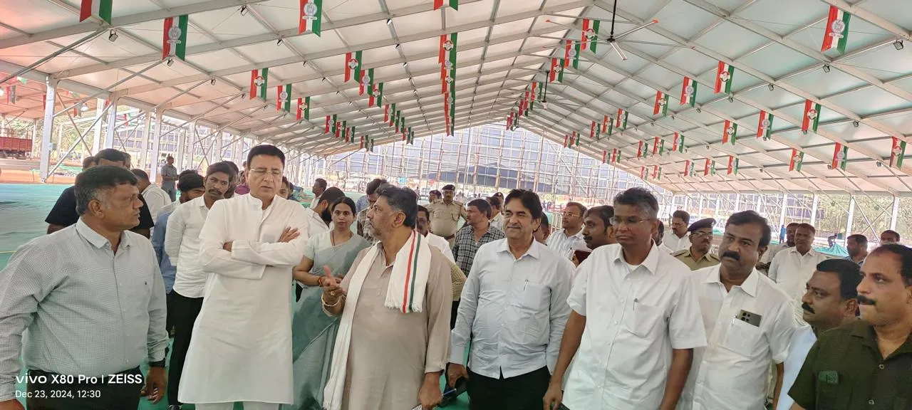 बेळगावच्या सीपीएड मैदानावर काँग्रेस अधिवेशनाचा महत्त्वाचा सोहळा होणार आहे. यावेळी देशभरातील काँग्रेसचे खासदार, मुख्यमंत्री, तसेच अनेक नेतेमंडळी उपस्थित राहणार आहेत. या कार्यक्रमात कोणतीही कमतरता राहू नये, यासाठी पूर्वतयारीची पाहणी मान्यवरांच्या उपस्थितीत करण्यात आली. यावेळी कर्नाटक काँग्रेसचे प्रभारी रणदीपसिंग सूरजेवाला, उपमुख्यमंत्री डी. के. शिवकुमार, पालकमंत्री सतीश जारकीहोळी, मंत्री लक्ष्मी हेब्बाळकर, आमदार राजू सेठ, आमदार गणेश हुक्केरी यांच्यासह काँग्रेसचे पदाधिकारी उपस्थित होते.
