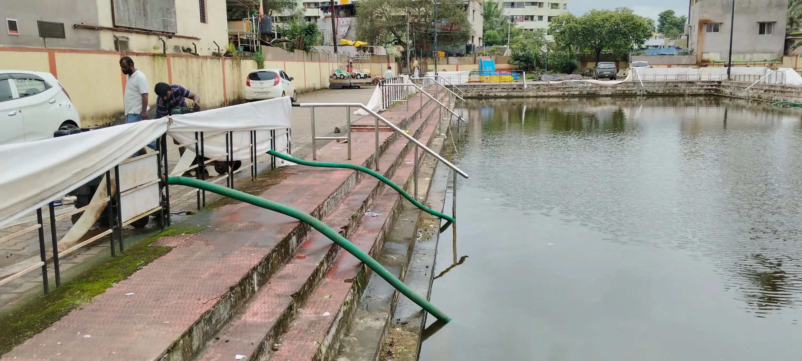 बेळगाव : गणेशोत्सव अवघ्या पाच दिवसांवर येऊन ठेपल्याने गणरायाच्या तयारीला वेग आला आहे. मनपा प्रशासनातर्फे शहरातील गणेशमूर्ती विसर्जन तलावांच्या स्वच्छतेचे काम हाती घेण्यात आले आहे. कपिलेश्वर मंदिर येथील तलावाची रविवारी स्वच्छता करण्यात आली. शहरात 380 हून अधिक सार्वजनिक गणेशोत्सव मंडळे आहेत. त्याबरोबर अलीकडे घरगुती गणेश मूर्तींची संख्याही लक्षणीय वाढली आहे. या गणेश मूर्तींचे विसर्जन तलावातून केले जाते. कपिलेश्वर तलाव, जुने बेळगाव, अनगोळ, जक्कीनहोंडा आदी ठिकाणी असलेल्या तलावातून श्री मूर्तींचे विसर्जन होते. विशेषत: जक्कीनहोंडा येथील तलावामध्ये घरगुती गणेश मूर्तींचे विसर्जन अधिक होते. कपिलेश्वर विसर्जन तलावातील दूषित पाणी मोटर इंजिनच्या साहाय्याने बाहेर काढण्यात आले. शिवाय तलावाची स्वच्छता करण्यात आली आहे. तसेच तलावात नवीन पाणी भरले जाणार आहे. गणेशोत्सव काळात दीड दिवस, सात दिवस आणि 11 दिवसांच्या गणेश मूर्तीही मोठ्या प्रमाणात विसर्जित केल्या जातात. या पार्श्वभूमीवर मनपातर्फे तलाव स्वच्छ करण्यात आला आहे. तलावातील दूषित पाणी बाहेर काढून त्यामध्ये नवीन पाणी भरण्यासाठी तयारी सुरू झाली आहे. गणेशोत्सवासाठी शहरातील सर्वच विसर्जन तलाव सज्ज केले जात आहेत.
