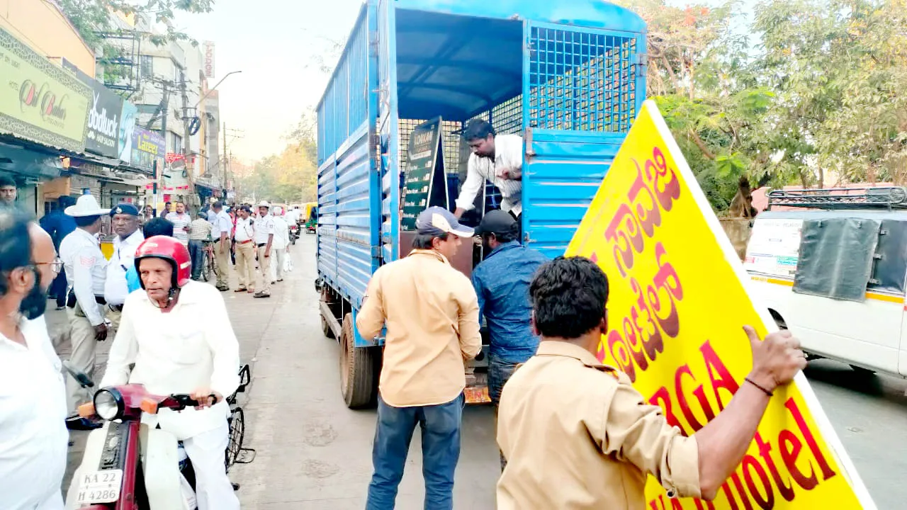 मनपा-रहदारी पोलिसांची कारवाई : मध्यवर्ती बसस्थानक ते संगोळ्ळी रायण्णा चौकापर्यंतच्या रस्त्यावरील अतिक्रमणांवर कारवाई