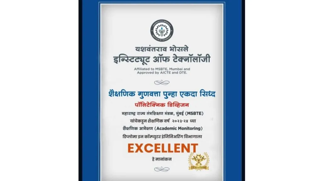 यशवंतराव भोसले इन्स्टिट्यूट ऑफ टेक्नॉलॉजी मधील कॉम्प्युटर इंजिनिअरिंग डिप्लोमा विभागाला महाराष्ट्र राज्य तंत्रशिक्षण मंडळ, मुंबई यांच्यामार्फत केल्या जाणाऱ्या मूल्यांकनामध्ये एक्सलंट हे सर्वोच्च मानांकन प्राप्त झाले आहे. मंडळाशी संलग्न संस्थांची गुणवत्ता निश्चित करण्यासाठी हे मूल्यांकन करण्यात येते.यामध्ये अध्यापन पद्धत, निकाल ,राबविण्यात येणारे शैक्षणिक व इतर उपक्रम ,इंडस्ट्रियल व्हिजिट, तज्ञांची व्याख्याने, व्यक्तिमत्व उद्योजकता विकास कार्यक्रम, प्लेसमेंट आदी अनेक गोष्टींचा समावेश असतो. सर्व बाबींची काटेकोर तपासणी केल्यानंतर मंडळामार्फत पुअर, सॅटिसफॅक्टरी, गुड ,व्हेरी गुड , एक्सलंट अशा श्रेणीमध्ये मानांकन देण्यात येते. यापैकी यशवंतराव भोसले इन्स्टिट्यूट ऑफ टेक्नॉलॉजी मधील कॉम्प्युटर इंजिनिअरिंग डिप्लोमा विभागाला एक्सलंट हे सर्वोच्च मानांकन प्राप्त झाले आहे. कॉम्प्युटर विभागाला मिळालेल्या यशाबद्दल संस्थेचे कार्याध्यक्ष अच्युत सावंत-भोसले, प्राचार्य डॉ.रमण बाणे, उपप्राचार्य गजानन भोसले यांनी यांनी विभागप्रमुख व शिक्षकांचे अभिनंदन केले व पुढील वाटचालीस शुभेच्छा दिल्या.