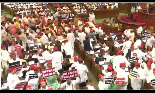 उत्तरप्रदेश विधानसभेचे अधिवेशन सोमवारी गोंधळात सुरू झाले आहे. कामकाज सुरू होताच समाजवादी पक्षाच्या आमदारांनी गोंधळ घालण्यास सुरुवात केली. एक तास 10 मिनिटांपर्यंत राज्यपाल आनंदीबेन पटेल यांचे अभिभाषण चालले. यादरम्यान सप आमदार ‘राज्यपाल वापस जाओ’ अशा घोषणा देत राहिले. तसेच सरकारविरोधी, महागाई आणि बेरोजगारीसंबंधीचे फलक त्यांनी झळकविले आहेत. सभापतींसमोरील मोकळय़ा जागेत पोहोचून सप आमदारांनी गोंधळ घातल्याने कामकाज मंगळवारी सकाळी 11 वाजेपर्यंत स्थगित करण्यात आले. 6 दिवस चालणाऱया या अधिवेशनात योगी आदित्यनाथ यांचे सरकार 26 मे रोजी अर्थसंकल्प मांडणार आहे.