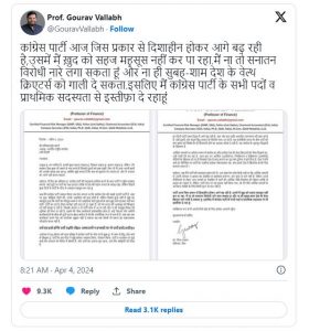 काही महिन्यांपूर्वी विविध वृत्तवाहिन्यांवरील चर्चात्म कार्यक्रमांमध्ये काँग्रेसची बाजू ठामपणे मांडणारे या पक्षाचे लोकप्रिय प्रवक्ते गौरव वल्लभ यांनी भारतीय जनता पक्षात प्रवेश केला आहे. काँग्रेस हा दिशाहीन पक्ष आहे. तो नेमका कोठे चालला आहे आणि त्याला कोण घेऊन जात आहे, हे कळावयास मार्ग नाही. ज्या पक्षात सनातनधर्मविरोधी घोषणा नित्यनेमाने द्याव्या लागतात आणि ईश्वराच्या नावाने खडे फोडावे लागतात, अशा पक्षामध्ये राहू शकत नाही, अशी स्पष्टोक्ती त्यांनी केली. गुरुवारी त्यांनी भारतीय जनता पक्षात प्रवेश केला. त्याआधी त्यांनी काँग्रेसमधील आपल्या सर्व पदांचे त्यागपत्र सादर केले. त्यांनी त्यांचे त्यागपत्र काँग्रेस अध्यक्ष मल्लिकार्जुन खर्गे यांच्याकडे ‘एक्स’ वरुन पाठविले. काँग्रेस पक्षासंबंधीचे त्यांचे सर्व आक्षेप त्यांनी त्यांच्या त्यागपत्रात स्पष्टपणे मांडले आहेत.