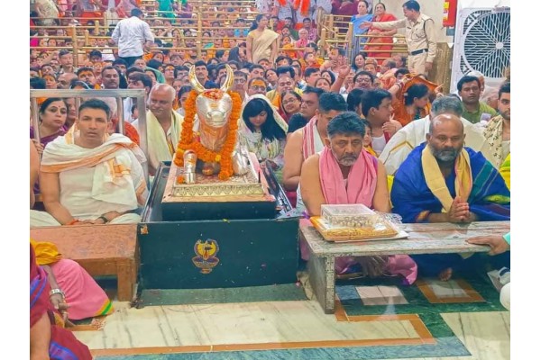 कर्नाटकचे उपमुख्यमंत्री डी. के. शिवकुमार यांनी शनिवारी रात्री आणि रविवारी सकाळी उज्जैनमधील प्रसिद्ध बाबा महाकाल यांची पूजा करत आशीर्वाद घेतले. महाकाल मंदिराचे पुजारी पंडित आशिष गुरू आणि पंडित महेश पुजारी यांनी त्यांच्या उपस्थिती गर्भगृहात पूजा-अर्चा केली. त्यानंतर त्यांनी नंदीच्या कानात आपली इच्छाही व्यक्त केली. यावेळी त्यांच्यासोबत आमदार महेश परमार, आमदार जितू पटवारी, शहर काँग्रेस अध्यक्ष रवी भदोरिया, जिल्हा काँग्रेस अध्यक्ष कमल पटेल आदी नेते उपस्थित होते.