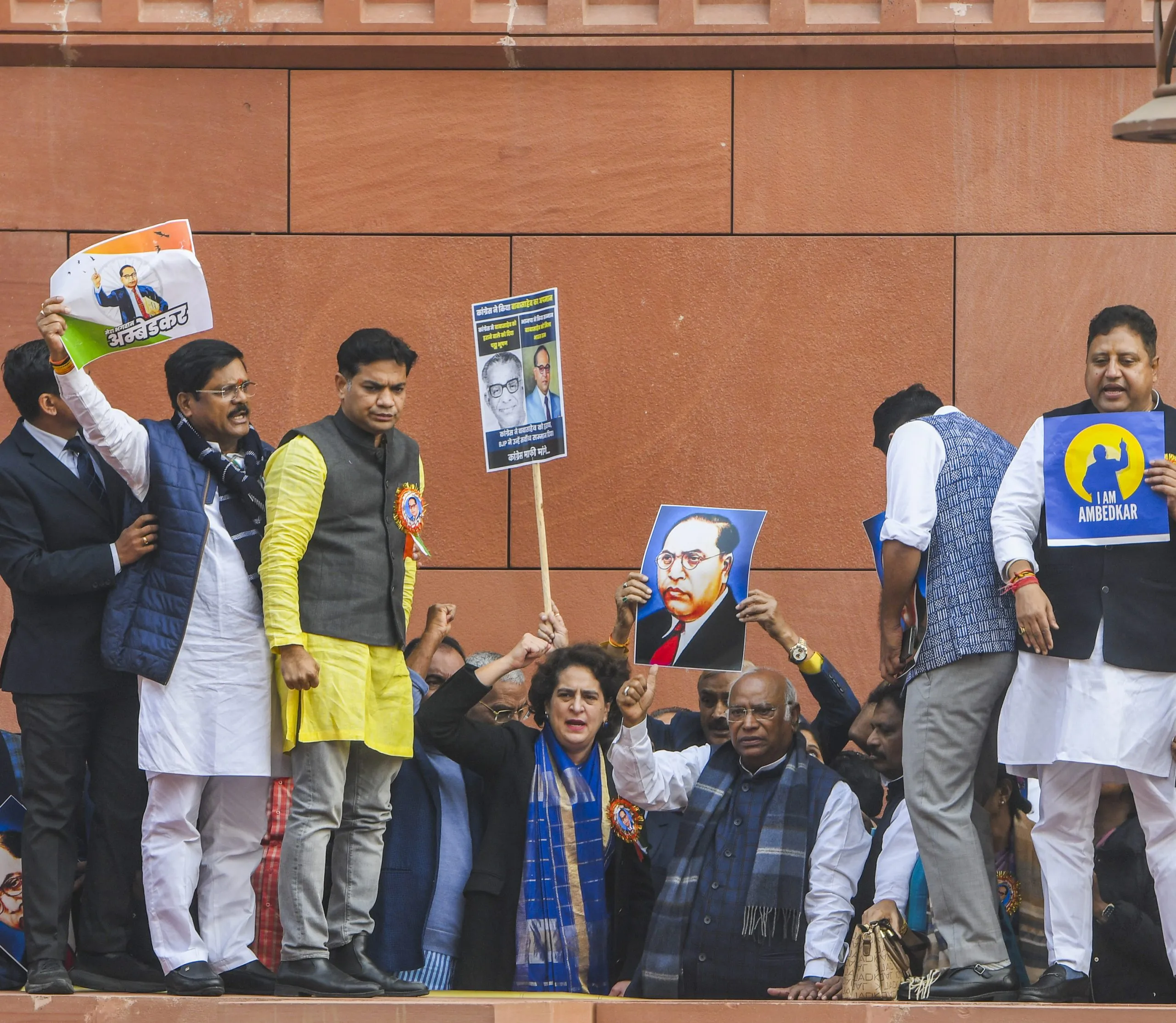 संसद परिसरात गुरुवारी भारतीय जनता पक्ष आणि काँग्रेस दोन्ही पक्षांच्या अनेक खासदारांनी निदर्शने केली. काँग्रेसने आंबेडकरांचा अवमान अनेकदा केला आहे. आजही काँग्रेसची या संदर्भातील भूमिका तशीच आहे. आम्ही डॉ. बाबासाहेब आंबेडकरांचा अवमान सहन करणार नाही. आंबेडकरांचा अवमान काँग्रेसने सातत्याने केल्याची अनेक उदाहरणे आहेत. संसदेतील चर्चेत ती स्पष्ट झाली आहेत, असे प्रतिपादन भारतीय जनता पक्षाच्या आंदोलक खासदारांनी केले. तर काँग्रेसच्या आणि इतर विरोधी पक्षांच्या खासदारांनीही गुरुवारी संसद परिसरात निदर्शने करीत केंद्रीय गृहमंत्री अमित शहा यांच्या त्यागपत्राची मागणी केली.