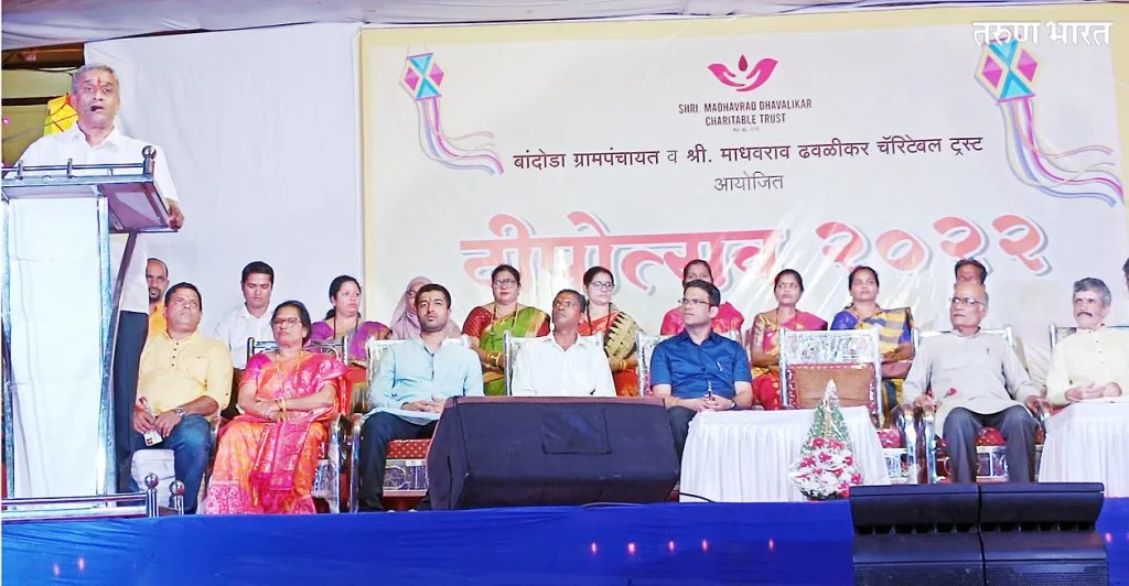 बांदोडा येथील स्व. भाऊसाहेब बांदोडकर मैदानावर माधवराव ढवळीकर ट्रस्ट व बांदोडा पंचायत यांच्या संयुक्त विद्यमाने आयोजीत केलेल्या ‘दीपोत्सव 2022’ या संस्कृतिक कार्यक्रमात ते बोलत होते. यावेळी बांदोडाचे सरपंच सुखानंद गावडे, कवळे जिल्हा पंचायत सदस्य गणपत नाईक, दै. तरुण भारतचे निवासी संपादक सागर जावडेकर, डॉ. गोविंद काळे, माधवराव ढवळीकर ट्रस्टचे संचालक मिथील ढवळीकर, संकेत मुळे, वीज खात्याचे अभियंते स्टीफन फर्नांडिस सार्वजनीक बांधकाम खात्याच्या अभियंत्या सौ. बांदेकर, सहाय्यक अभियंते अरविंद फडते, जिल्हा पंचायत सदस्य दामोदर नाईक, बांदोडार्चें उपसरपंच चित्रा फडते, मुक्ता नाईक, वामन नाईक, रामचंद्र नाईक, व्यंकटेश गावडे, राजू नाईक, मडकइं& पंचायतीचे सरपंच शैलेंद्र पणजीकर, कुंडईचे सरपंच सर्वेश कुंडईकर, कवळेच्या सरपंच मनुजा नाईक, तळावलीच्या सरपंच वसुंधरा सावंत तळावलीकर, दुर्भाट आगापूरच्या सरपंचा क्षिप्रा आडपईकर आदी उपस्थीत होते.