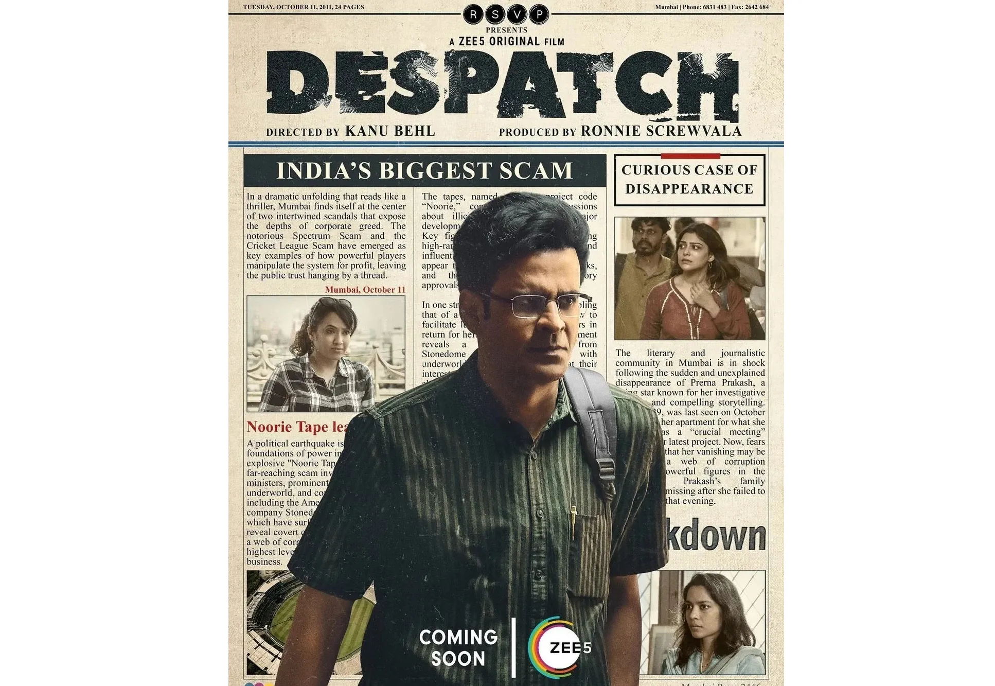 ‘अगली बार पत्थर नहीं गोली बरसेगी अस संवाद असलेली भूमिका मनोज वाजपेयी साकारत आहे. एका चित्रपटात मनोज वाजपेयी हा निडर पत्रकाराच्या भूमिकेत आहे. दिग्दर्शक कनु बहल यांच्या डिस्पॅच या चित्रपटाचा टीजर प्रदर्शित करण्यात आला असून यात शोध पत्रकारितेचे पैलू दाखविण्यात आले आहेत. जॉय या नावाची व्यक्तिरेखा मनोज वाजपेयी साकारत आहे. जॉयला पॅकअप कर आणि घरी जा अशी धमकी देण्यात येत असल्याचे टीझरमध्ये दिसून येते. तर धमकीला न घाबरता जॉय हा सत्याचा शोध घेत असतो. 8 हजार कोटी रुपयांच्या घोटाळ्याप्रकरणी हा पत्रकार तपास करत असतो. इशानी बॅनर्जी आणि कनु बहल यांनी याची पटकथा लिहिली आहे. तर रॉनी स्क्रूवाला आणि आरएसव्हीपी मूव्हीजकडून याची निर्मिती करण्यात आली आहे. तर सिनमेटोग्रॉफीची जबाबदारी सिद्धार्थ दीवान यांनी सांभाळली असून एडिटिंग समर्थ दीक्षित यांनी केले आहे. डिस्पॅच हा चित्रपट 13 डिसेंबर रोजी झी5 वर प्रदर्शित होणार आहे.