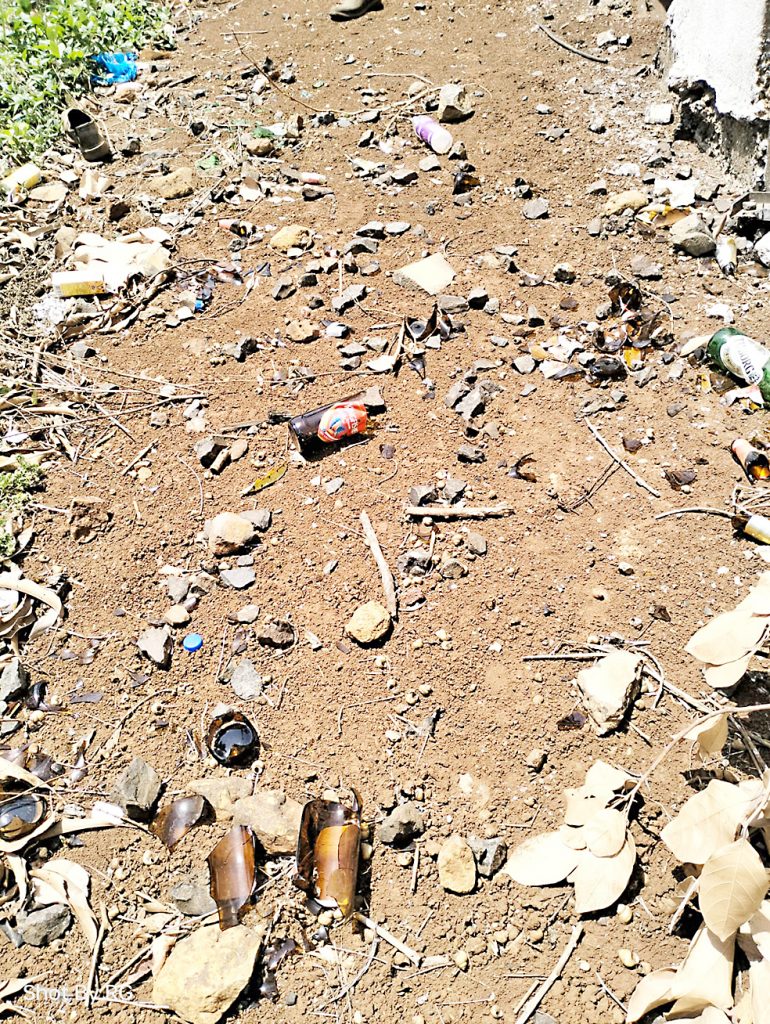 फोडलेल्या बाटल्यांच्या काचांमुळे शेतकऱ्यांना धोका