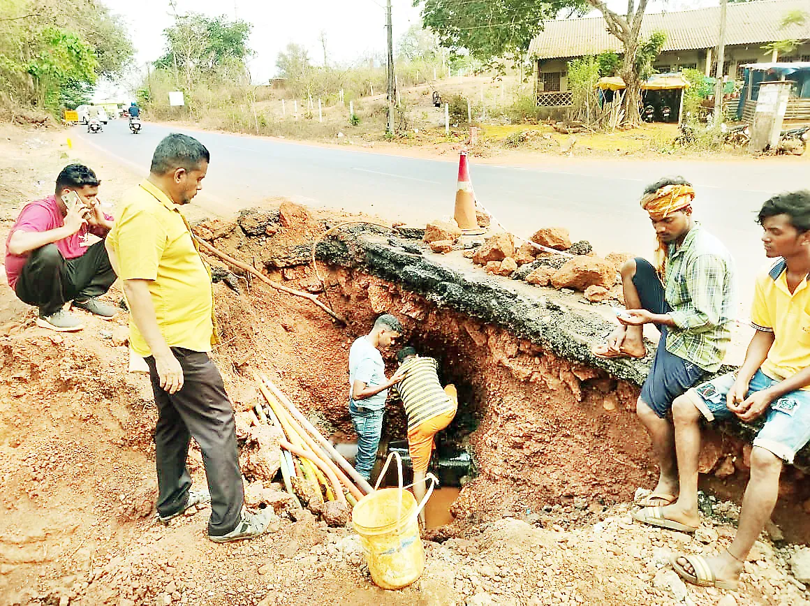 या भमिगत वीजवाहिन्या घालण्याचे काम सध्या डिचोली शहरातून मुस्लीमवाडा येथे मुख्य रस्त्याचा बाजूला सुरू आहे. हे काम करताना गुरु. दि. 6 रोजी संध्याकाळी पोलीस क्वॉटर्सजवळ रस्त्याच्या खालून असलेली डिचोली व मये मतदारसंघाला पाणीपुरवठा करणारी मुख्य 350 डायमीटरची जलवाहिनी फुटली. त्यामुळे पाण्याचा जोरदार प्रवास सुरू झाला. या जोरदार पाण्याच्या दबावामुळे रस्त्याला खालून भलेमोठे भगदाड पडले. तर हजारो लीटर पाणी बराच वेळ वाहून गेले. तर फुटलेल्या जलवाहिनीमुळे डिचोली व मये मतदारसंघातील बहुतेक भागांना पाण्यापासून वंचित रहावे लागले. संध्याकाळनंतर डिचोली व मये मतदारसंघातील नळ कोरडे पडले होते. ते काल शुक्र. दि. 7 एप्रिल रोजी दुपारपर्यंत पाणीपुरवठा खंडित होता. त्यामुळे लोकांची बरीच अडचण झाली. दुसऱ्या बाजूने साबांखाच्या पाणीपुरवठा विभागाकडून या जलवाहिनीचे दुरुस्तीकाम युद्धपातळीवर हाती घेण्यात आले होते. रात्री उशिरापर्यंत तसेच सकाळीही हे काम सुरूच होते. डिचोलीचे आमदार डॉ. चंद्रकांत शेट्यो, नगराध्यक्ष कुंदन फळारी, स्थानिक नगरसेवक रियाझ बेग, मयेचे आमदार प्रमेंद्र शेट यांनी याची दखल घेऊन दुरुस्तीकाम तातडीने पूर्ण करण्याच्या सूचना केल्या. अखेर शुक्रवारी दुपारी सर्व काम पूर्ण होऊन पाणीपुरवठा सुरळीत करण्यात आला. त्यानंतर डिचोली व मये मतदारसंघातील लोकांनी सुटकेचा नि:श्वास सोडला.