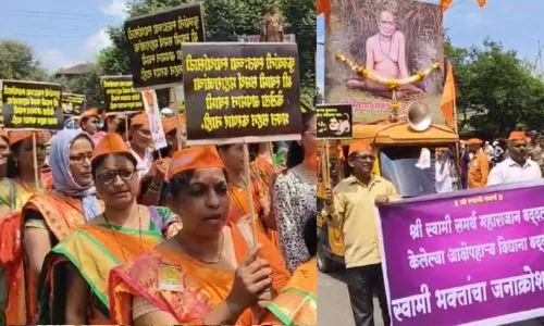 ठाणें- मुंबई येथे संभाजी ब्रिगेडने आयोजित केलेल्या कार्यक्रमात ज्ञानेश महाराव यांनी प्रभू श्रीराम आणि स्वामी समर्थ यांच्यावर केलेल्या टिपण्णीला स्वामी भक्तांमध्ये नाराजी पसरली असून आज कोल्हापूरात स्वामीभक्तांकडून निषेध मोर्चा काढण्यात आला. जिल्हाधिकारी कार्यालयावर काढण्यात आलेल्या या धडक मोर्चामध्ये स्वामीभक्तांनी ज्ञानेश महाराव आणि संभाजी ब्रिगेड यांचा निषेध करत त्यांच्यावर योग्य ती कारवाई करण्याची मागणी करण्यात आली.