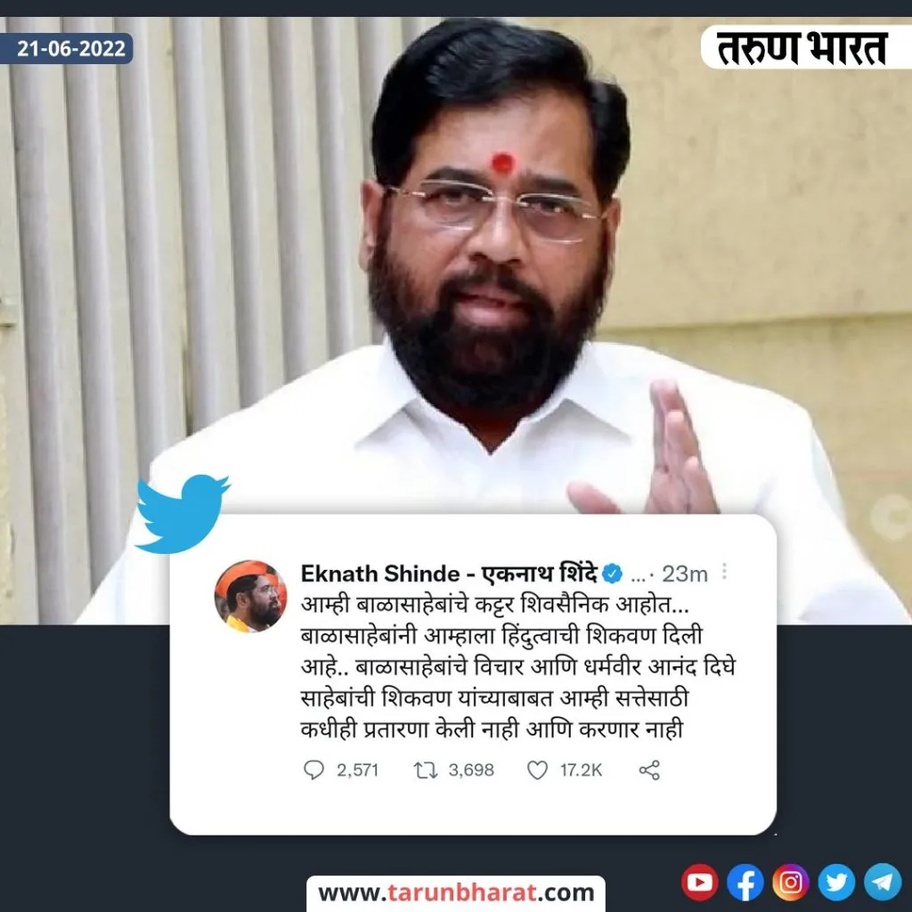 आम्ही बाळासाहेबांचे कट्टर शिवसैनिक आहोत. बाळासाहेबांनी आम्हाला हिंदुत्वाची शिकवण दिली आहे. बाळासाहेबांचे विचार आणि धर्मवीर आनंद दिघे साहेबांची शिकवण यांच्याबाबत आम्ही सत्तेसाठी कधीही प्रतारण केली नाही आणि करणार नाही असे ट्विट केले आहे.