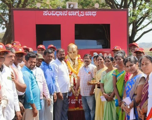 संविधान अंमलबजावणीच्या 75 व्या वर्धापन दिनानिमित्त 26 जानेवारीपासून सर्वत्र संविधान जागृती रथयात्रा सुरू आहे. ही रथयात्रा 25 फेब्रुवारी 2024 पर्यंत चालणार आहे. संविधान रथयात्रा शुक्रवारी कित्तूर तालुक्यातून खानापूर तालुक्यात आली. खानापूर तालुक्यातील विविध ग्रामपंचायतींद्वारे संविधान जागृती रथयात्रेचे स्वागत करण्यात येत आहे. शनिवारी बिडी ग्राम पंचायतीच्यावतीने भव्य स्वागत करण्यात आले. ग्रामपंचायत अध्यक्ष संतोष काशीलकर यांनी ज्योत पेटवून स्वागत केले. यावेळी ग्रामपंचायतीचे सर्व सदस्य, विविध संघ संस्थांचे पदाधिकारी, माजी सैनिक, साई व्यापारी संघाचे पदाधिकारी, बिडी येथील विविध शाळांचे शिक्षक व विद्यार्थी, अंगणवाडी व आशा कार्यकर्त्या, विविध खात्यांचे अधिकारी व गावातील नागरिक मोठ्या संख्येने उपस्थित होते. बिडी गावच्या वेशीत संविधान रथयात्रेचे वाजतगाजत स्वागत करण्यात आले. त्यानंतर बिडी बसस्थानकाजवळ संविधान रथयात्रा आल्यानंतर तेथे संविधान प्रस्तावनेचे वाचन करण्यात आले. त्यानंतर सांस्कृतिक कार्यक्रम झाले. खानापूर तालुक्यातील प्रत्येक ग्रामपंचायतीपर्यंत रथयात्रा पोहोचणार असून सोमवार दि. 19 रोजी खानापूर येथील जांबोटी क्रॉसजवळ सभा व सांस्कृतिक कार्यक्रम होणार आहेत. येथे संविधानावर आधारित कार्यक्रम साजरे केले जाणार आहेत.