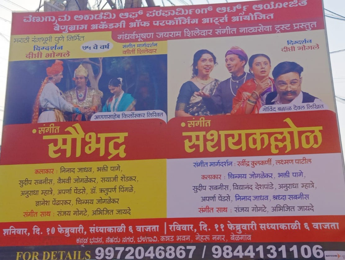 बेळगाव : नाट्या व संगीत क्षेत्रातील कलाकारांना व्यासपीठ मिळावे व त्यांच्यातर्फे विविध सांस्कृतिक कार्यक्रमांचे आयोजन करावे, या हेतूने बेळगावमध्ये ‘वेणुग्राम अकॅडमी ऑफ परफॉर्मिंग आर्ट्स’ या संस्थेची स्थापना झाली आहे. आपला पहिलाच उपक्रम म्हणून या संस्थेतर्फे दि. 10 व 11 फेब्रुवारी रोजी अनुक्रमे ‘संगीत सौभद्र’ व ‘संगीत संशयकल्लोळ’ या दोन नाट्याप्रयोगांचे कन्नड भवन, नेहरूनगर येथे आयोजन केले आहे. गंधर्वभूषण जयराम शिलेदार आणि शिलेदार कुटुंबीयांनी संगीत रंगभूमीला जीवदान मिळावे, यासाठी बरेच प्रयत्न केले. याच हेतूने 1993 मध्ये बेळगावातच जन्म झालेले जयराम शिलेदार यांनी मराठी संगीत नाटकांमध्ये अनेक भूमिका केल्या. त्यांच्याच नावाने संगीत नाट्या सेवा ट्रस्टची स्थापना झाली आहे. या ट्रस्टअंतर्गत संगीत नाटक आणि नाट्यासंगीताला पुन्हा उजाळा देणे, संगीत नाटक, वेशभूषा, नेपथ्य, रंगभूषा याबाबत कार्यशाळा घेणे, नवोदित कलाकारांना मराठी संगीत नाटकांचा वारसा पुढे नेण्यासाठी प्रोत्साहित करणे व जुन्या मराठी संगीत नाटकांचे डिजिटलायझेशन करणे हे ट्रस्टचे हेतू आहेत. ट्रस्टच्या संचालक कीर्ती शिलेदार यांनी आजवर महाराष्ट्र आणि भारतभर अनेक नाट्याप्रयोग सादर केले आहेत. याच संस्थेची मराठी रंगभूमी ही संस्था जयराम शिलेदार व पद्मश्री जयमाला शिलेदार यांनी 1949 मध्ये स्थापन केली. ऑक्टोबर 2023 मध्ये या संस्थेने 74 वर्षे पूर्ण करून 75 व्या वर्षात पदार्पण केले आहे. याच अमृतमहोत्सवी वर्षाचा उपक्रम म्हणून हे दोन नाट्याप्रयोग बेळगावला होत आहेत.