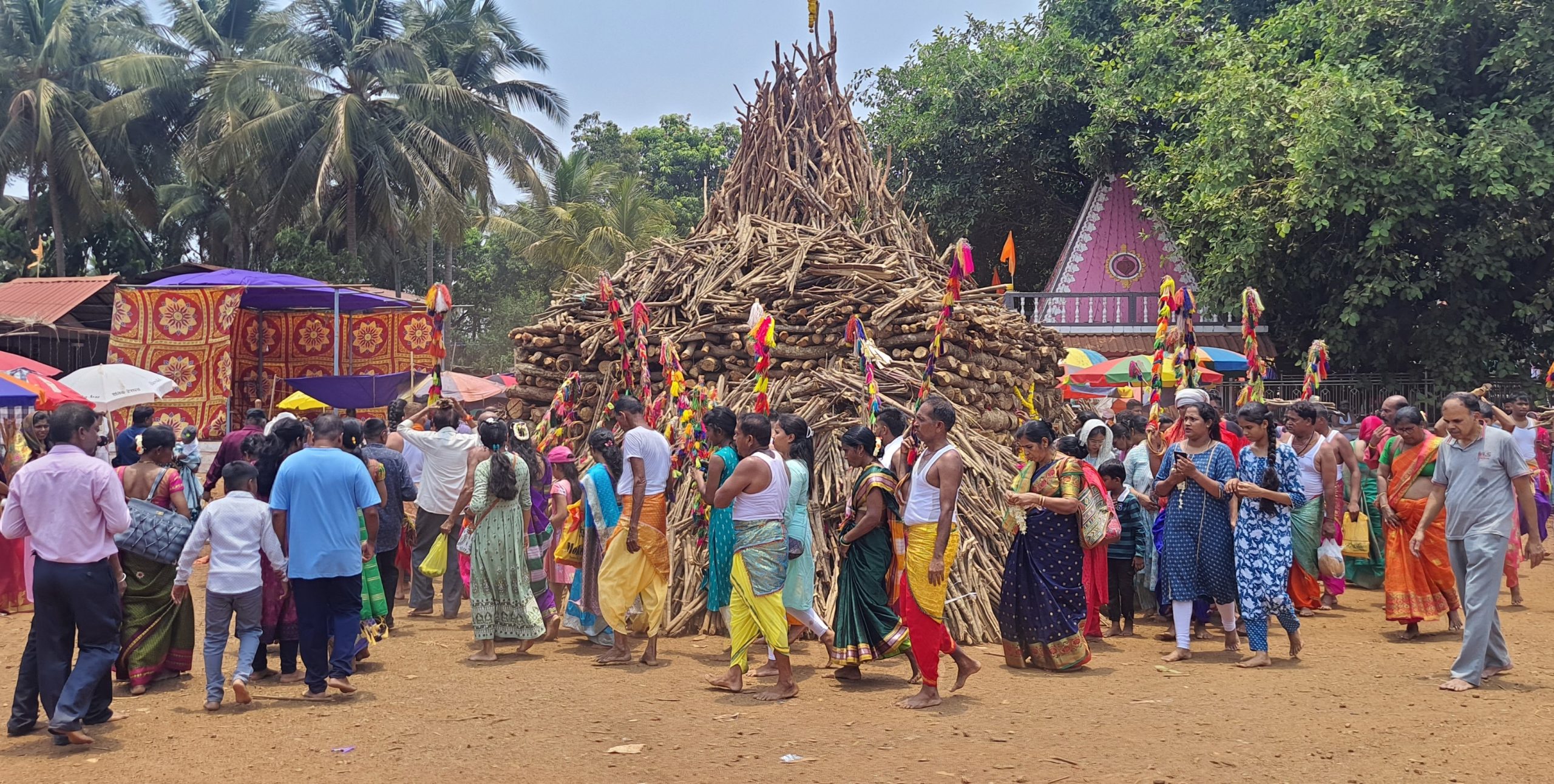 डिचोली : असह्य उकाड्याची तमा न बाळगता देवी लईराईच्या अनंत श्र्रध्दा व प्रेमापोटी अंगाची लाहीलाही होत असतानाही हजारोंच्या संख्येने भाविक, भक्तांनी शिरगावात कार रविवारी सकाळपासूनच गर्दी केली होती. श्री देवी लईराई माता की जयच्या अखंड गजरात देवी लईराईच्या जत्रोत्सवासाठी जमलेल्या भाविकांच्या गर्दीने गाव अगदी फुलून गेला होता. हातात रंगबिरंगी गोण्यांनी सजविलेली बेतकाठी घेऊन विविध रंगांची सोवळी परिधान केलेल्या धोंडगणांमुळे या जत्रोत्सवातील उत्साह ओसंडून वाहत होता. लईराई देवीचा जत्रोत्सव रविवारी आल्याने भाविक भक्तांसाठी ती एक पर्वणीच ठरली. सकाळपासूनच हजारोंच्या संख्येने भाविकांनी शिरगावात उपस्थिती लावली होती. दुपारी 12 वा. च्या सुमारास मयेतील चौगुले मानकरी देवीस कवळास घेऊन आल्यानंतर खऱ्या अर्थाने जत्रोत्सवाला प्रारंभ झाला. ढोलावर काठी पडताच शिरगावातील वातावरणात चैतन्य निर्माण झाले आणि धोंडगण हातातील वेतकाठी हवेत फिरवत मंडपात थिरकू लागले. दिवसभर लाखो लोकांनी देवीच्या दर्शनासाठी उपस्थिती लावली, रात्री तर अक्षरश: भाविक भक्तांचा महापुरच आला होता. धोंडगण आणि लोकांच्या साक्षीने मंगळवारी पहाटे देवी आपल्या धोंडगणांसह अग्निदिव्य मार्गक्रमण करून आपला पण पूर्ण करणार आहे. नंतर चार दिवस कौलोत्सव चालणार आहे. देवीचा कळस शिरगावातील घरांच्या अंगणात जाऊन त्या घारातील कुटुंबियांना व लोकांनाही कौलप्रसाद देणार आहे.