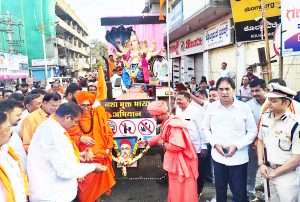 बेळगाव : ‘गणपती बाप्पा मोरया’चा अखंड जयघोष, ढोलताशांच्या बरोबरच डीजेवर थिरकणारी तरुणाई, भाविकांची लक्षणीय गर्दी यामुळे फुलून गेलेले रस्ते अशा वातावरणात श्रीमूर्ती विसर्जन मिरवणूक भक्तिमय वातावरणात पार पडली. शनिवारी सायंकाळी सुरु झालेली ही मिरवणूक तब्बल 24 तासांहून अधिक वेळ सुरु होती. मुंबई-पुण्यापाठोपाठ बेळगावची श्री विसर्जन मिरवणूकही वैशिष्ट्यापूर्ण ठरते. यंदाही त्याचे प्रत्यंत्तर आले. हुतात्मा चौक येथून विसर्जन मिरवणुकीला शनिवारी सायंकाळी 6 वाजता सुरुवात झाली. तत्पुर्वी जिल्हाधिकारी मोहम्मद रोशन, पोलीस आयुक्त भूषण बोरसे, महापालिका आयुक्त शुभा बी., आमदार असिफ सेठ, माजी आमदार अनिल बेनके, महापौर मंगेश देसाई, उपमहापौर वाणी जोशी, हुक्केरी हिरेमठाचे चंद्रशेखर शिवाचार्य महास्वामी, गणेशपूर येथील रुद्रकेसरी मठाचे हरिगुरु महाराज, महामंडळाचे अध्यक्ष रमाकांत कोंडुसकर, रणजीत चव्हाण-पाटील,अॅड. हणमंत कोंगाली, विजय जाधव आदी उपस्थित होते. श्रीगणेशाची आरती केल्यानंतर श्रीफळ वाढवून विसर्जन मिरवणुकीस प्रारंभ झाला.