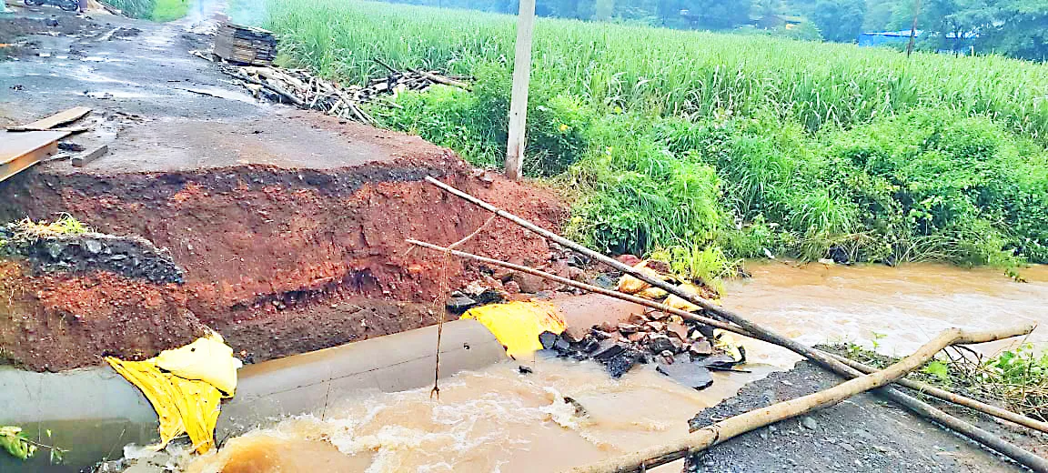 गेल्या आठ दिवसांपूर्वी झालेल्या मुसळधार पावसामुळे बाळगमट्टी शिवाराकडे जाणाऱ्या रस्त्यावरील पूल कोसळला आणि नाल्यातून येणाऱ्या पाण्यामुळे सदर पूल वाहून गेला. यामुळे आता बाळगमट्टी शिवारात जायचे कसे? याची चिंता या भागातील शेतकऱ्यांना लागून राहिली आहे. शिवाराकडे जाणारा एकमेव पूल कोसळल्याने बळीराजा हतबल झाला आहे. तालुक्यात यंदा मुसळधार पाऊस झाला. यामुळे सर्वत्र पाणीच पाणी झाले. नदी-नाल्यांना पूर आला. अजूनही नदी व नाल्याच्या काठावरील शेतजमिनी पाण्याखाली गेल्या आहेत. यामध्ये भात व अन्य पिके कुजून गेली आहेत. याचा फटका शेतकऱ्यांना बसला आहे. बाळगमट्टी शिवाराकडे जाणाऱ्या रस्त्यावर हा महत्त्वाचा पूल होता. डोंगर भागातून येणारे पाणी या पुलावरील नाल्यातून जाते. पावसाने जोर अधिक घेतला होता. यामुळे नाला तुडुंब भरून वाहात होता. या पाण्याच्या प्रवाहामुळे सदर पूल कोसळला व तो वाहून गेला. सध्या या रस्त्यावरील वाहतूक बंद झाली आहे.
