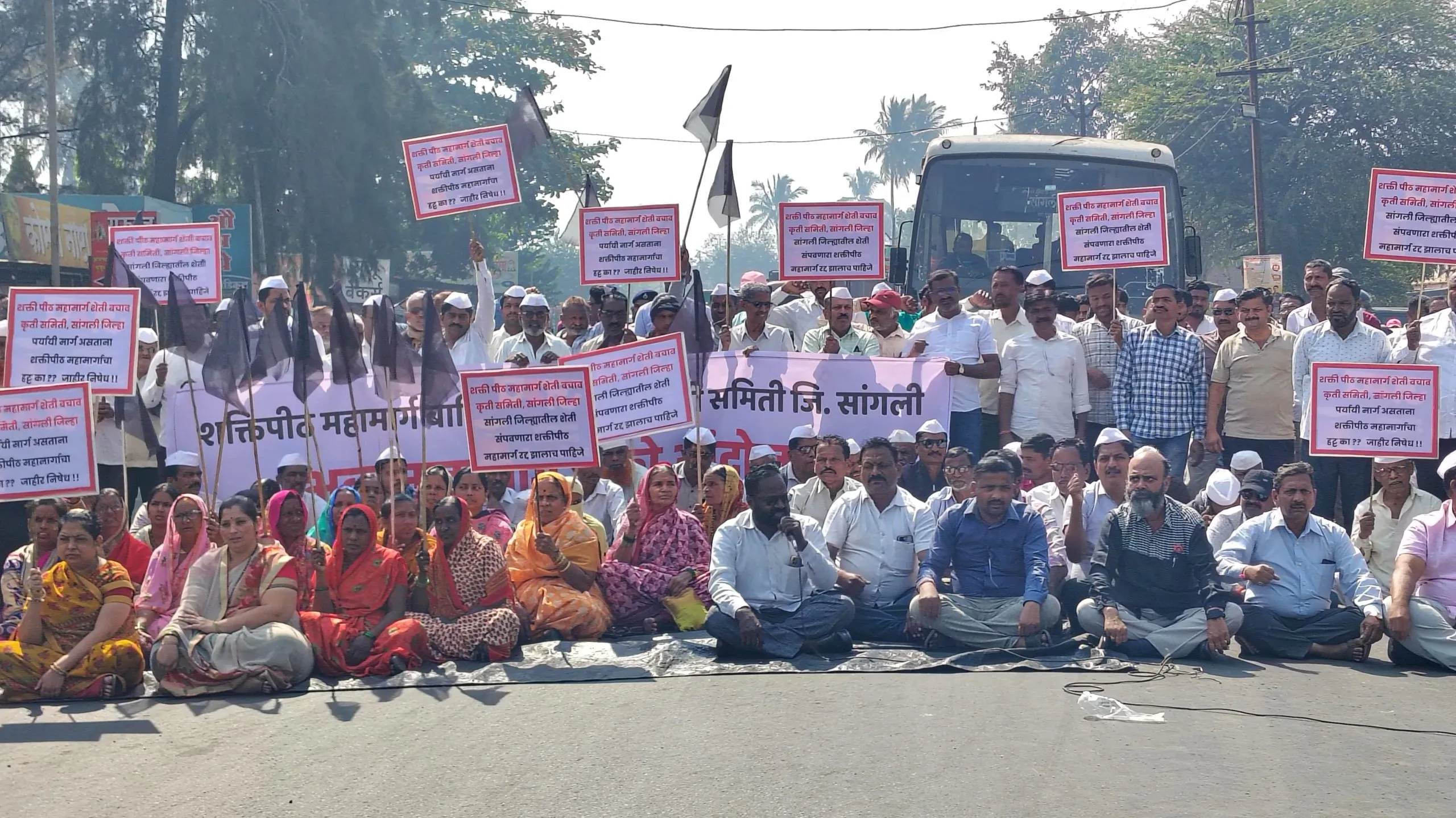 शक्तिपीठ महामार्ग रद्द करा’ या मागणीसाठी सांगलीत शक्तीपीठ महामार्ग बाधित शेतकऱ्यांनी रास्ता रोको आंदोलन केले. या महामार्गासाठी बाधित होणाऱ्या शेतकऱ्यांनी मोठ्या प्रमाणावर आंदोलनात सहभाग नोंदवला. अंकली येथे दोन्ही बाजूंनी वाहनांच्या लांबच लांब रांगा होत्या. आंदोलकांना पोलिसांनी ताब्यात घेतले.