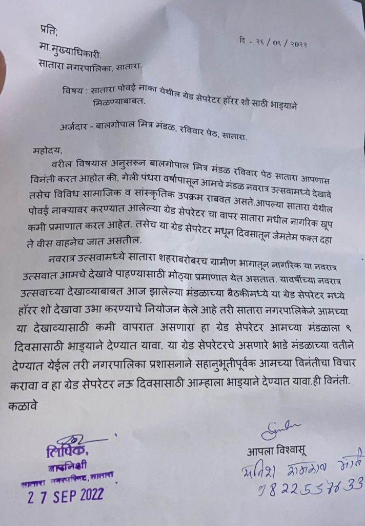 त्या पत्रामध्ये नमुद केले आहे की, बाल गोपाळ मित्र मंडळ आपणास विनंती करतो की, गेल्या पंधरा वर्षांपासून आमचे मंडळ नवरात्र उत्सवात देखावे सादर करते. विविध सामाजिक सांस्कृतिक उपक्रम राबवते. आपल्या सातारा येथील ग्रेड सेपरेटरचा वापर नागरिक खूप कमी प्रमाणात करतात. दिवसातून दहा ते पंधरा वाहने जात असतील. नवरात्र उत्सवात सातारा शहर व ग्रामीण भागातून नागरिक देखावे पाहण्यासाठी येत असतात. यावर्षी नवरात्र उत्सवात देखाव्याबाबत मंडळाच्या आज झालेल्या बैठकीत ग्रेड सेपरेटर मध्ये हॉरर शो करण्याचा निर्णय घेण्यात आला. सातारा नगरपालिकेने हा कमी वापरात असलेला ग्रेड सेपरेटर आमच्या मंडळाला 9 दिवसासाठी देखावा करण्यासाठी भाड्याने देण्यात यावा, ग्रेड सेपरेटरचे भाडे मंडळाकडून देण्यात येईल, नगरपालिकेने याचा सहानुभूतीपूर्वक विचार करावा, अशी विनंती केली आहे.