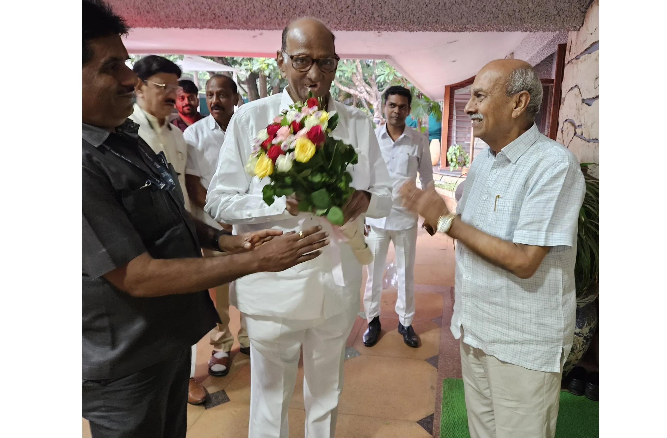 बेळगाव : माजी केंद्रीय मंत्री व राष्ट्रवादी काँग्रेस (शरदचंद्रजी पवार) पक्षाचे अध्यक्ष शरद पवार हे दोन दिवसांच्या बेळगाव भेटीवर आले आहेत. शुक्रवारी दुपारी त्यांचे बेळगावमध्ये आगमन झाले. शनिवार दि. 26 रोजी येळ्ळूर येथे होणाऱ्या मराठी मॉडेल शाळेच्या शतकोत्तर सुवर्णमहोत्सवानिमित्त आयोजित कार्यक्रमात सहभागी होणार आहेत. त्याचबरोबर कार्यकर्त्यांच्या भेटी घेणार आहेत. शुक्रवारी आंबोली (सावंतवाडी) येथून त्यांचे बेळगावमध्ये आगमन झाले. दुपारी त्यांनी केएलईचे चेअरमन व माजी राज्यसभा सदस्य डॉ. प्रभाकर कोरे यांच्या घरी सदिच्छा भेट दिली. यावेळी प्रभाकर कोरे व त्यांच्या कुटुंबीयांनी त्यांचे स्वागत केले. यानंतर त्यांनी राष्ट्रवादी काँग्रेस पक्षाच्या इंजिनिअर सेलच्या अध्यक्षा अमित देसाई यांच्या भांदूर गल्ली येथील घराला भेट दिली. यावेळी म. ए. समितीच्या पदाधिकाऱ्यांनी त्यांची भेट घेऊन त्यांच्यासमोर अनेक विषय मांडले.