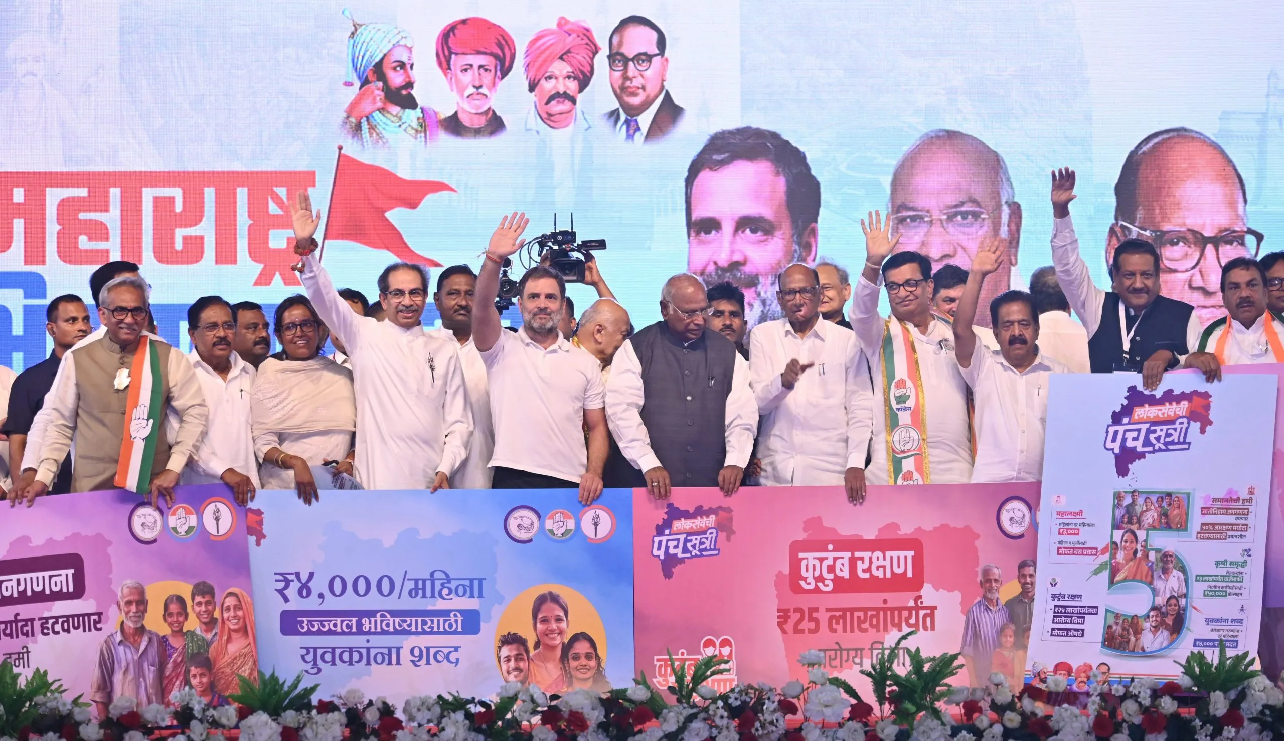 राज्यातील महाविकास आघाडीची पहिली संयुक्त सभा मुंबईतील बीकेसी येथे होत असून महाविकास आघाडीचा जाहीरनामा काँग्रेस नेते राहुल गांधी, राष्ट्रवादी काँग्रेसचे शरद पवार, शिवसेना युबीटी पक्षाचे उद्धव ठाकरे यांच्यासह दिग्गज नेत्यांच्या उपस्थितीत प्रसिद्ध करण्यात आला. महाविकास आघाडीच्या जाहीरनाम्यातून मोठ्या घोषणा करण्यात आल्या असून महिलांना मोफत बससेवा देण्यात येणार आहे. तर, लाडक्या बहिणींना 3000 रुपये दरमहा देण्यात येणार असल्याची घोषणाही करण्यात आली आहे.