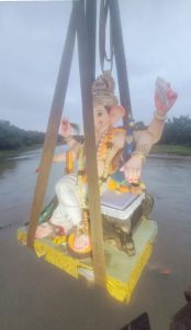 शहरासह विद्यानगर, शिवाजीनगर, हलकर्णी, दुर्गानगर, गुरुकुल कॉलनी, हिंदूनगर यासह शहरातील सर्व गल्ल्यांतून घरगुती गणपती डोक्यावरुन, चारचाकी वाहनातून आणण्यात येत होत्या. फटाक्यांची आतषबाजी, ढोलताशांच्या गजरात तसेच गणपती बाप्पा मोरया, पुढच्या वर्षी लवकर या… गणपतीच्या जय जय कार…च्या घोषणा देत, गणपती विसर्जन मलप्रभा नदीघाटावर करण्यात आले. शेवटची पूजाविधी आणि आरतीनंतर गणपतींचे विसर्जन करण्यात येत होते. विसर्जन रात्री उशिरापर्यंत सुरू होते. घरगुती आणि सार्वजनिक गणपती विसर्जनासाठी नगरपंचायतीने खास व्यवस्था केली होती. घाटावर प्रकाश योजना, क्रेनची व्यवस्थाही केली होती. नगरपंचायतीचे कर्मचारी आणि बचाव पथकही तैनात केले होते.गणपती विसर्जन पार्श्वभूमीवर पोलीस निरीक्षक लालसाब गवंडी, पोलीस उपनिरीक्षकासह मोठ्या फौजफाटा तैनात केला होता.