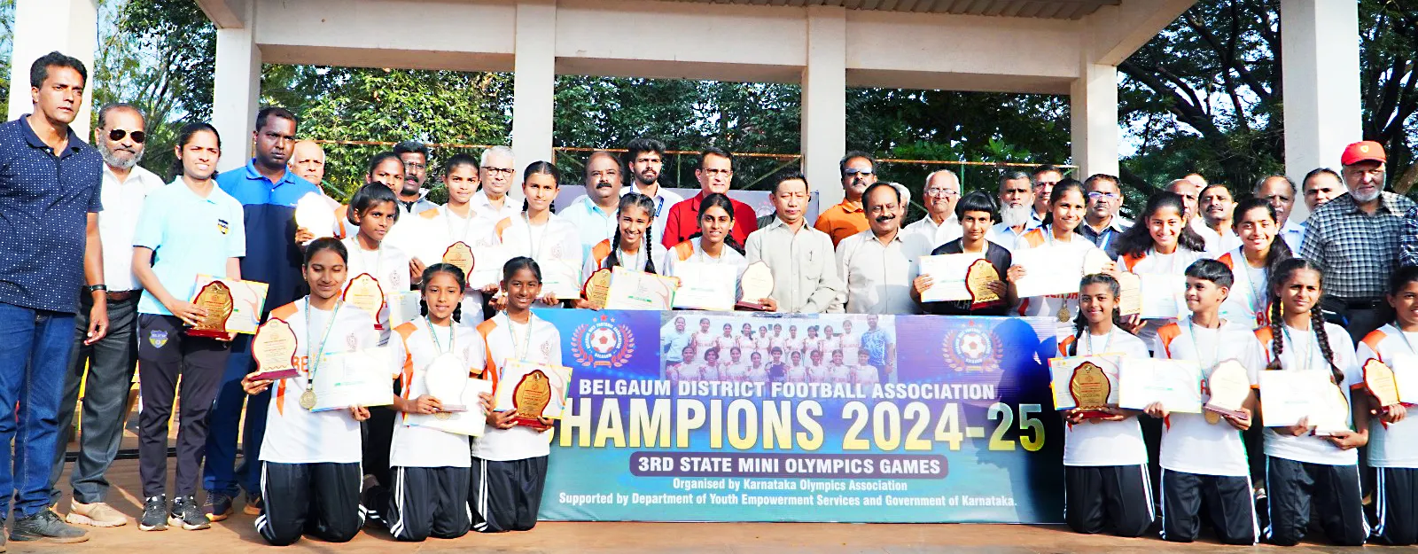 बेळगाव : बेंगळूर येथे कर्नाटक ऑलिम्पिक संघटना व युथ सक्षमीकरण सर्व्हिस यांच्या संयुक्त विद्यमाने आयोजित 14 वर्षांखालील तिसऱ्या मिनी ऑलिम्पिक राज्यस्तरीय आंतरजिल्हा फुटबॉल स्पर्धेच्या अंतिम सामन्यात बेळगाव जिल्हा संघाने कारवार जिल्हा संघाचा 4-0 असा पराभव करुन विजेतेपद पटकाविलेल्या बेळगाव जिल्हा संघाचा पोलीस आयुक्तांकडून खास गौरव करण्यात आला. पहिल्या सामन्यापासून अंतिम सामन्यापर्यंत बेळगावने एकही सामना न हरता आपली विजयी घौडदौड कायम राखली. या संघात वैभवी सायनेकर, तेजल हंसी, मारिया मुजावर, मयुरी तिम्मापूर, मालिका बाडीवाले, जानवी चव्हाण, प्रांजल हजरी, अवनी सानिकोप्प, वैष्णवी होसमनी, तनिष्का सप्रे, इफा अत्तार, रोहिणी कांबळे, इफा बडेभाई, सायल कुडतरकर, क्लेस्ट्रा मधुराई, वैष्णवी संकपाळ, इंद्रायणी पावनोजी, श्रद्धा पाटील आदी खेळाडूंचा समावेश असून संघाचे व्यवस्थापक म्हणून मानस नाईक तर प्रशिक्षक म्हणून हेमांशी गौर यांनी या संघाला योग्य मार्गदर्शन केले. या खेळाडूंचा पोलीस आयुक्त येडा मार्टीन मार्बन्यांग, मधुकर सामंत, आनंद सराफ, ज्ञानेश कलघटगी, जीएसएस महाविद्यालयाचे प्राचार्य अरविंद हलगेकर, प्राचार्य एस. एन. देसाई, रामकृष्ण एन., प्रशांत मनकाळे, आनंद रत्नापगोळ, विनय नाईक, बेळगाव जिल्हा फुटबॉल संघटनेचे अध्यक्ष पंढरी परब, लेस्टर डिसोजा, गोपाळ खांडे, सचीव अमित पाटील, जॉर्ज राँड्रीग्ज, प्रशांत देवदानम, रवी चौगुले, एस. एस. नरगोडी, अनिकेत पतकी आदी मान्यवरांच्या हस्ते या विजेत्या संघाचा खास गौरव करण्यात आला. व पुढील कारकिर्दीसाठी शुभेच्छा देण्यात आल्या.
