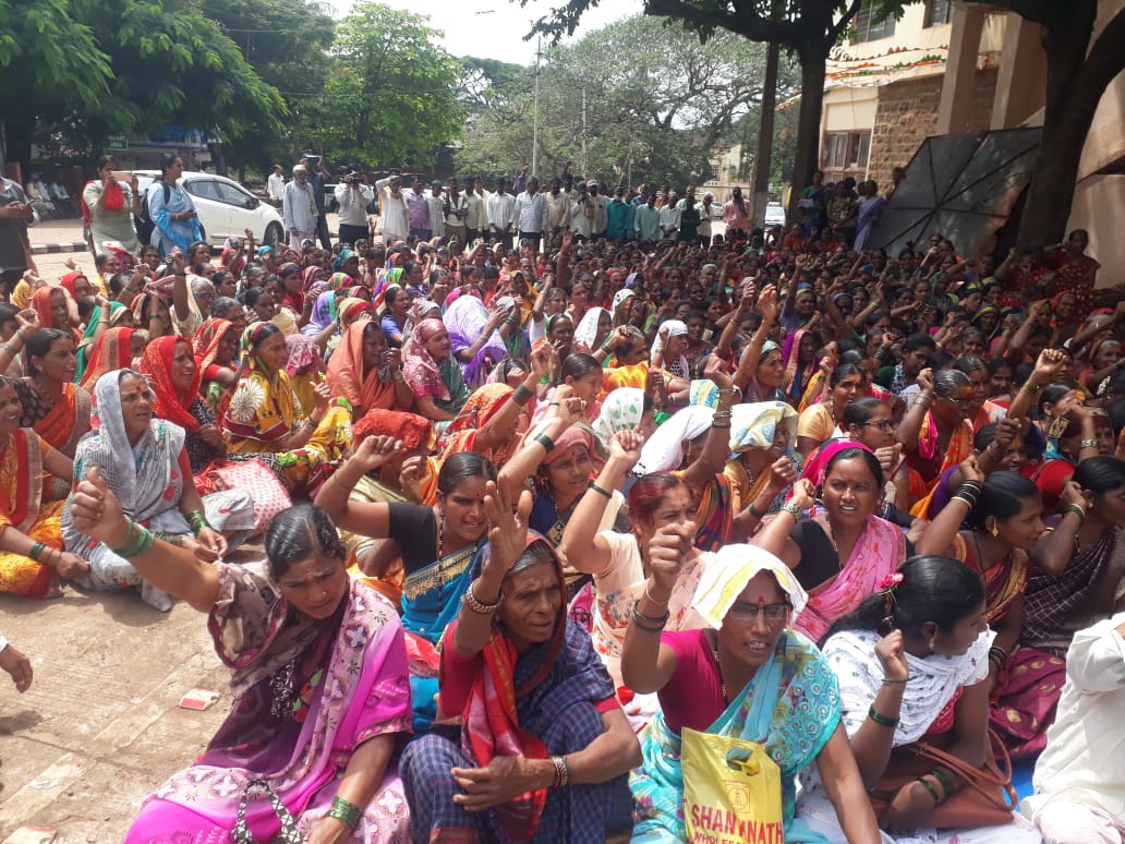 बेळगाव : देशभरात गांधी जयंती मोठ्या उत्साहात साजरी केली जात आहे. तर राज्य सरकार गावागावात मद्यविक्रीची दुकाने सुरू करण्यासाठी पुढाकार घेत आहे. याला विरोध करत महिला संघटनांकडून जिल्हाधिकारी कार्यालयासमोर आंदोलन करत सरकारचा निषेध नोंदविण्यात आला. सरकारने घेतलेला निर्णय मागे घ्यावा, अशी मागणीही करण्यात आली. दारू नको दूध द्या, बिअर नको पाणी द्या, अशा घोषणाही देण्यात आल्या. मद्य निषेध आंदोलन आणि ग्रामीण कुलीकामगार संघटना यांच्यातर्फे जिल्हाधिकारी कार्यालयासमोर आंदोलन करण्यात आले. गांधी जयंतीनिमित्त हे आंदोलन रविवारपासून सुरू आहे. सोमवारी मोठ्या संख्येने महिला जमून राज्य सरकारच्या मद्य विक्री धोरणाचा तीव्र शब्दात निषेध करण्यात आला आहे. प्रत्येक ग्राम पंचायतीमध्ये मद्य विक्री दुकान सुरू करण्यासाठी सरकारकडून परवानगी दिली जात आहे. तसे केल्यास समाजात अशांतता निर्माण होईल. ग्रामीण भागातील तरुण व्यसनाच्या आहारी जाऊन तरुणपिढी बरबाद होईल. सरकार एकीकडे विकासाच्या योजना राबवून मदत करत आहे तर ग्रामीण भागामध्ये मद्य विक्रीची दुकाने सुरू करून जनतेला व्यसनाच्या खाईत लोटत आहे.