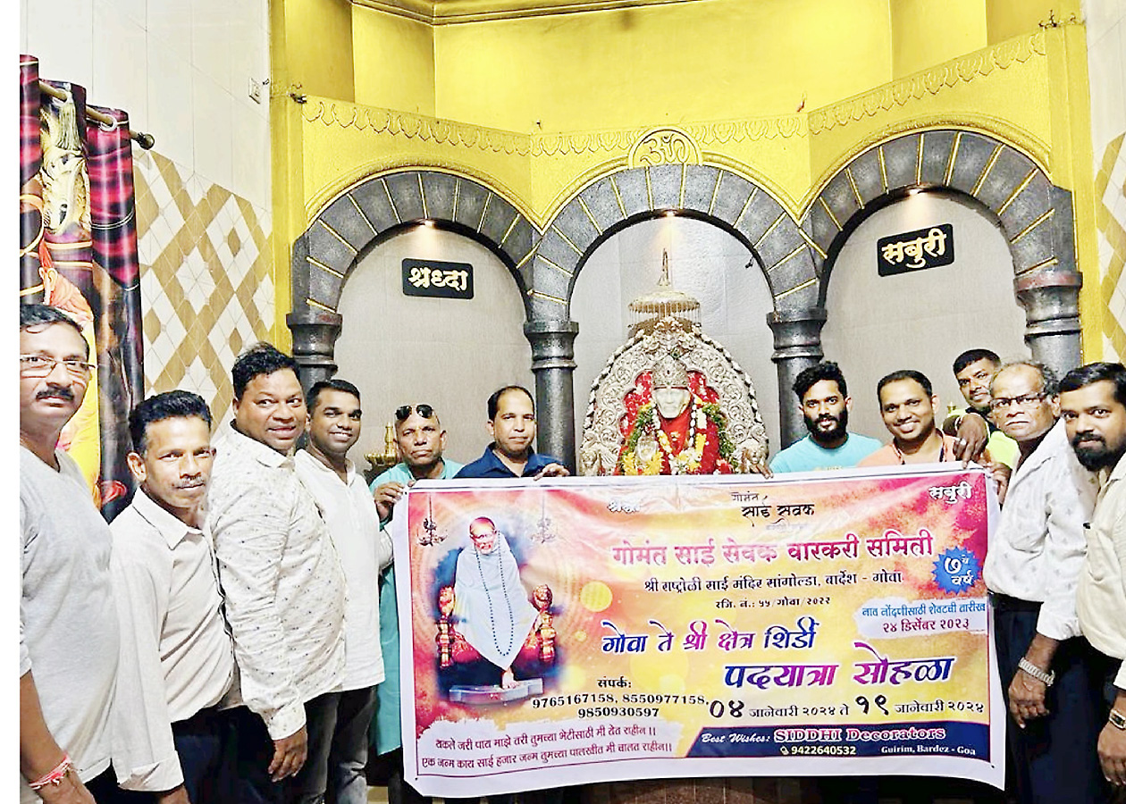 कुंभारजुवे : गोमंत साई सेवक वारकरी समिती गोवा आयोजित 7वी गोवा ते शिर्डी पदयात्रा 4 जानेवारी 2024 ते 19 जानेवारी 2024 या कालावधीत आयोजित करण्यात आली आहे. 4 जानेवारी 2024 रोजी दुपारी 2.30 वा श्री राष्ट्रोळी साई मंदिर सांगोल्डा बार्देश येथून साई नामाचा जयघोष करीत ढोल ताशांचा गजरात पालखी संगे पदयात्रेस शुभारंभ होणार आहे. सुमारे 400 साई भक्त या पालखी सोहळ्यात सहभागी होणार आहेत. इच्छुक साईसेवकांना पदयात्रेत सहभागी व्हायचे असेल तर 9765167158 / 8550977158 / 9850930597 या भमणध्वीवर संपर्क साधावा. श्री राष्ट्रोळी साई मंदिर सांगोल्डा बार्देश येथे गुऊवारी 9 नोव्हेंबर 2023 रोजी पदयात्रा नामफलकाचे अनावरण करण्यात आले. समितीचे अध्यक्ष सचिन कासकर, सचिव प्रेमानंद कोचरेकर, खजिनदार सोनल नाईक, रोहिदास कोरगावकर, सुशिल मोरजकर व अन्य मान्यवर याप्रसंगी उपस्थित होते.तरी साईसेवक व भाविकांनी या पदयात्रेत मोठ्या संख्येने सामील होऊन साईंची कृपादृष्टी व स्वर्गसुखाचा आनंद उपभोगावा असे गोमंत साई सेवकचे अध्यक्ष सचिन कासकर यांनी आवाहन केले आहे.
