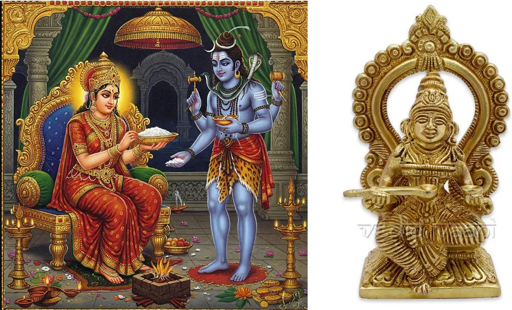 सासरघरी जाताना नववधूला श्री अन्नपूर्णेची मूर्ती देण्याची पद्धत आजही रूढ आहे. अन्नपूर्णा हा पार्वतीमातेचा अवतार आहे. डाव्या हाती पानपात्र व उजव्या हाती पळी असलेल्या पार्वतीचे लक्ष शिवाकडे आहे. कथा अशी आहे की एकदा शंकर-पार्वती सारीपाट खेळत होते तेव्हा पार्वती मातेने तिचे दागिने आणि शंकराने आयुधे पैजेसाठी काढून ठेवली. खेळ सुरू झाला. शंकर पहिला, दुसरा आणि पैज लावून खेळलेला प्रत्येक डाव हरले. पार्वतीचा जय झाला. हा पराभव शंकराला सहन झाला नाही म्हणून ते उद्विग्न होऊन देवदारच्या जंगलात तपश्चर्येला निघून गेले. तिथे विष्णू त्यांना समजावायला गेले आणि त्यांनी शंकर-पार्वतीला पुन्हा डाव खेळण्यासाठी एकत्र आणले. तेव्हा मात्र प्रत्येक वेळी शंकराचाच विजय झाला आणि पार्वती माता हरली. अचानक असे काय झाले? पार्वतीला शंका आली. तिने विष्णूंना विचारले असता ते म्हणाले की या डावातील फासा माझ्या इच्छेने पडत होता. तुम्हा दोघांमधला खेळ हा भ्रम असून मायेमुळे तुम्हाला तो खरा वाटला. सृष्टी ही मायाधीन असून प्रत्येकाचे जीवन हे फाशाप्रमाणे अनाकलनीय आहे. या तिघांमध्ये मायेबाबत वाद रंगला. शिव म्हणाले, देह नश्वर असून क्षणभंगुर आहे. एवढेच नाही तर अन्न हाही भ्रम असून ते मायेचेच एक रूप आहे. हे विधान मात्र पार्वतीला पटले नाही. ती म्हणाली, अन्न हा जर भ्रम असेल तर मी सुद्धा एक भ्रमच आहे. असे म्हणून ती गुप्त झाली. पार्वती ही प्रत्यक्ष प्रकृती आहे. तिच्यामुळे तर जग चालते. ती निघून गेल्याने सृष्टी स्तब्ध झाली. सृष्टीचे ऋतू, मास, पर्जन्य सारे काही नाहीसे झाले. विश्वाची उत्पत्ती खुंटली आणि सर्वत्र दुष्काळ पडून अन्नटंचाई निर्माण झाली. मानव आणि देव काकुळतीला आले असे बघून शक्तीशिवाय आपण अपूर्ण आहोत हे शिवाच्या लक्षात आले.