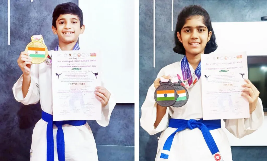 किणये : शिमोगा येथे कर्नाटक राज्य कराटे संघटना व शिमोगा सिटी कराटे संघटना यांच्या संयुक्त विद्यमाने आयोजित करण्यात आलेल्या तिसऱया आंतरराष्ट्रीय कराटे स्पर्धेत संभाजी नगर, मच्छे येथील निरुष संतोष ताशिलदार याने सुवर्ण पदक व रिया संतोष ताशिलदार हिने कांस्य पदक मिळविले. भाऊ-बहिणीने सुवर्ण व कांस्य पदक मिळविल्यामुळे मच्छे परिसरात त्यांचे कौतुक होत आहे. निरुष हा सेंट पॉल्स बेळगाव येथे इयत्ता पाचवीमध्ये शिकत असून त्याची बहिण रिया ही डीपी स्कूलची विद्यार्थिनी असून ती आठवीमध्ये शिकत आहे. निलेश गुरखा व गजेंद्र काकतीकर यांचे या दोघांना मार्गदर्शन लाभत आहे.