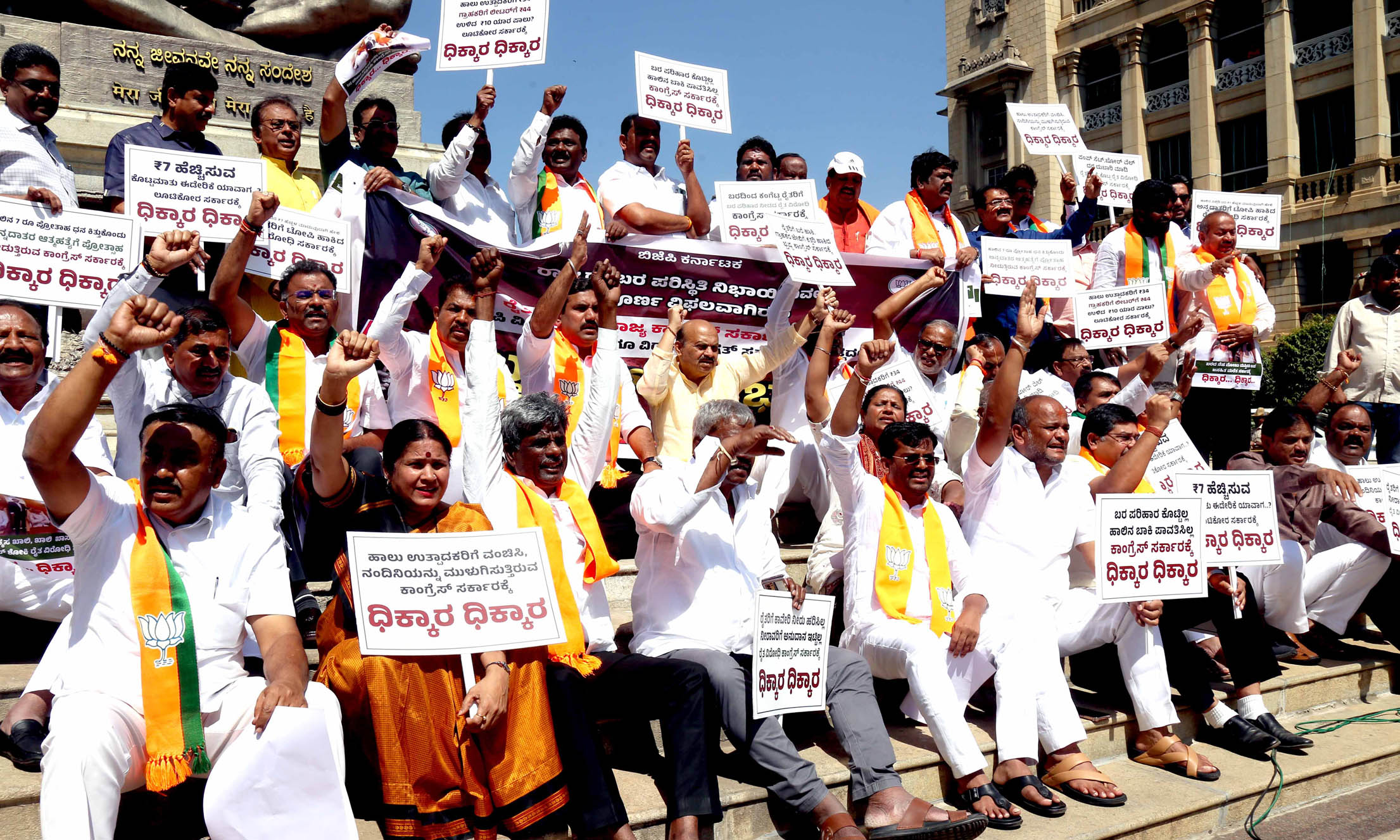 बेंगळूर : केंद्र सरकारविरोधात राज्य काँग्रेस सरकारने दिल्लीत आंदोलन हाती घेतलेले असतानाच राज्य भाजप नेत्यांनीही राज्य सरकारविरोधात बेंगळूरमध्ये आंदोलन केले. राज्यातील काँग्रेस सरकार दुष्काळ निवारण कामे राबविण्यात पूर्णत: अपयशी ठरले आहे. शेतकऱ्यांच्या समस्यांची सरकारने दखल घेतलेली नाही. तातडीने दुष्काळ निवारण कामे हाती घ्यावीत, अशी मागणी भाजप नेत्यांनी केली. भाजप प्रदेशाध्यक्ष बी. वाय. विजयेंद्र यांच्या नेतृत्वाखाली भाजपच्या आमदारांनी बेंगळूरमधील विधानसौध आवारातील महात्मा गांधी पुतळ्यासमोर धरणे आंदोलन छेडले. आंदोलनात माजी मुख्यमंत्री बसवराज बोम्माई, विधानसभेचे विरोधी पक्षनेते आर. अशोक, विधानपरिषद विरोधी नेते कोटा श्रीनिवास पुजारी व इतर आमदार सहभागी झाले. त्यांनी काँग्रेस सरकारच्या अपयशाविरोधात भित्तीपत्रके हाती धरून धिक्काराच्या घोषणा दिल्या. भाजप नेत्यांनी घोषणाबाजी करत विधानसौधला घेराव घालण्याचा प्रयत्न केला. यावेळी पोलिसांनी त्यांना ताब्यात घेऊन नंतर सुटका केली.