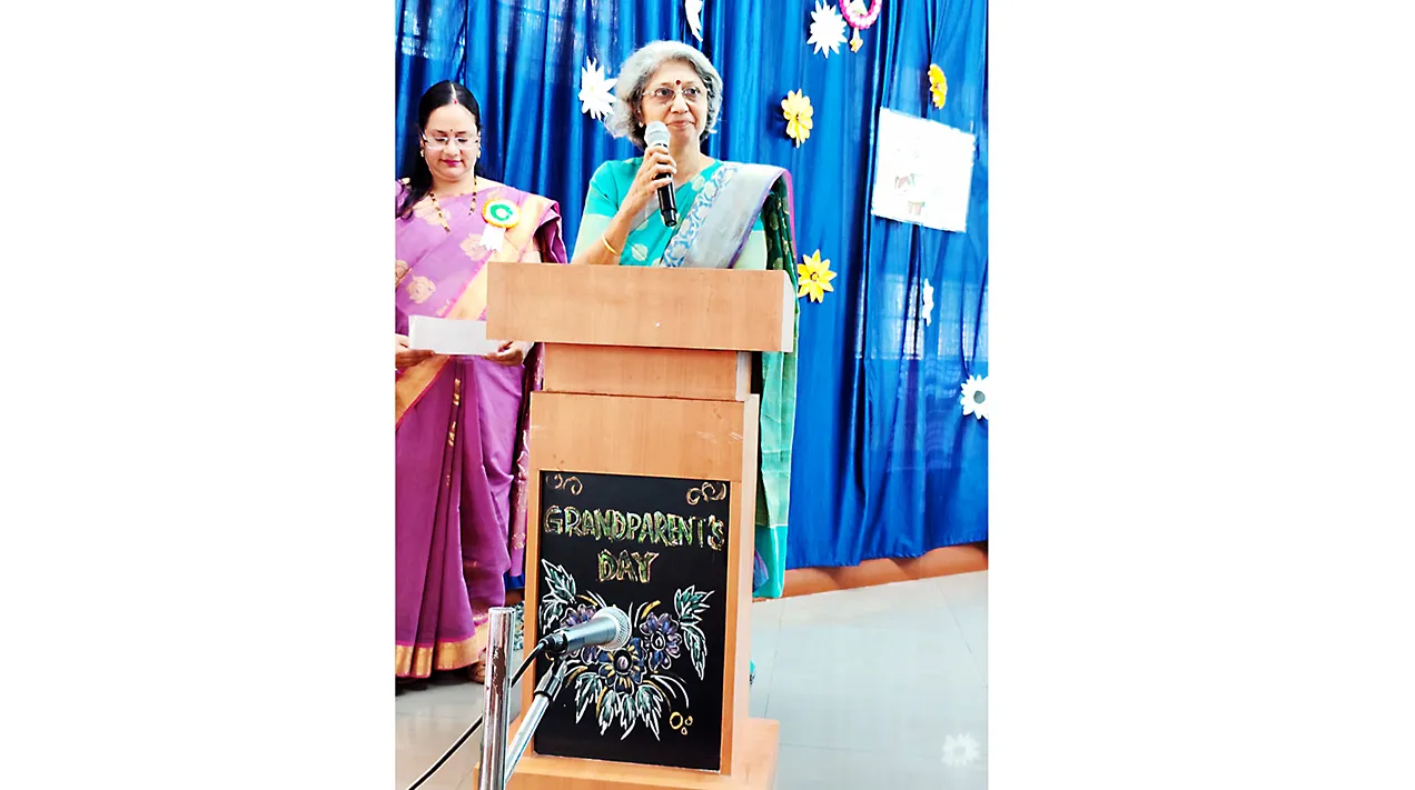 एम. व्ही. हेरवाडकर इंग्रजी माध्यम शाळेच्या रामकुमार जांग्रा किंडरगार्टनमध्ये आजी-आजोबा दिन साजरा करण्यात आला. प्रमुख पाहुण्या म्हणून सतारवादक अरुंधती सुखटणकर उपस्थित होत्या. यावेळी त्या म्हणाल्या, नातवंडे म्हणजे दुधावरची साय आहेत. आयुष्याच्या संध्याकाळी आपली जबाबदारी संपली, असे वाटत असताना घरच्या ज्येष्ठांनी बाहेरून आलेल्या सुनेला सांभाळून घेऊन तिला आपलेसे करणे ही आपली जबाबदारी आहे. नातवंडांमुळे आपले घर गोकुळ बनते. त्यांच्यातील सुप्त कलागुणांना वाव देऊन त्यांना भविष्यासाठी तयार करणे हे आजी-आजोबांना शक्य आहे, असे सांगितले. या निमित्ताने विविध मनोरंजनपर कार्यक्रम घेण्यात आले. बालचमूंनी ईशस्तवन सादर केले. मृणाल चव्हाण हिने स्वागतगीत सादर केले. दुर्वा पवार हिने आजी-आजोबांचे महत्त्व सांगितले. माही चिटणीस व अनिष्का द•ाrकर यांनी गीते सादर केली. याप्रसंगी शाळेच्या व्यवस्थापन मंडळाचे दिलीप चिटणीस, प्रवीण पुजार, गायत्री गावडे, मुख्याध्यापिका शोभा कुलकर्णी, के. जी. विभागाच्या दीपा कामत व शिक्षक उपस्थित होते.
