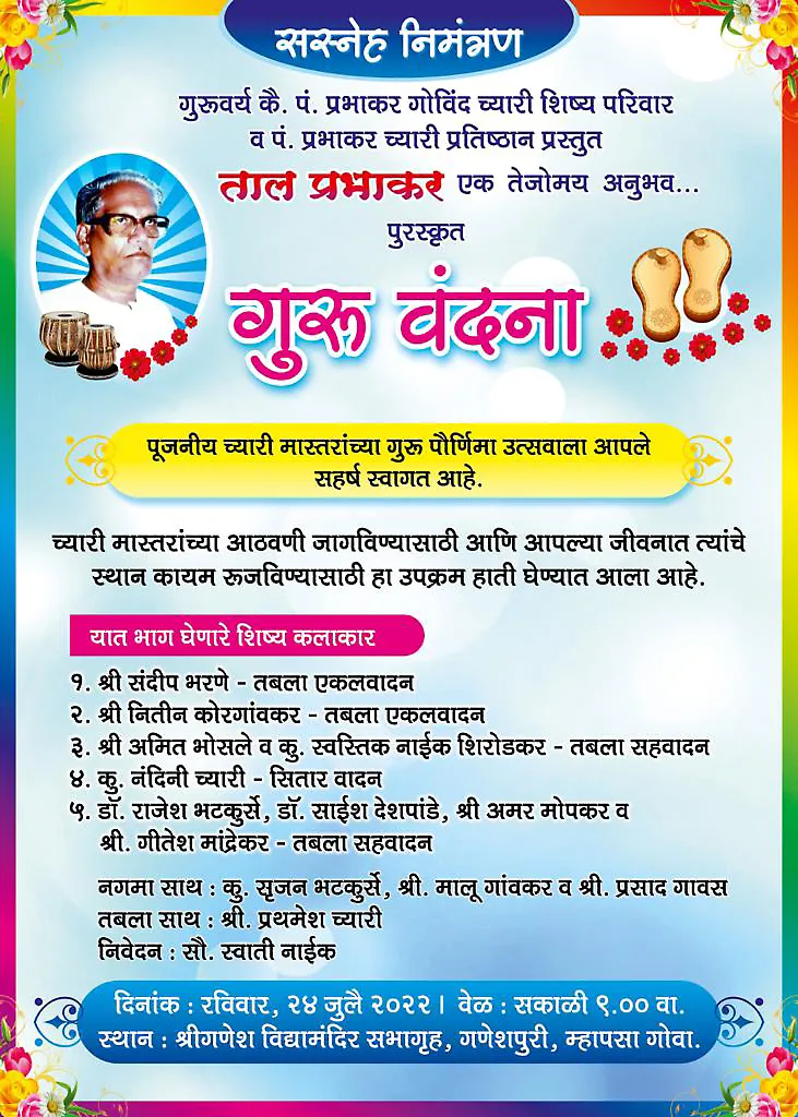 श्रीगणेश विद्यामंदिर सभागृह, गणेशपुरी, म्हापसा येथे रविवार 24 जुलै रोजी सकाळी 9 वा. गुरुवर्य कै. पं. प्रभाकर गोविंद च्यारी शिष्य परिवार व पं. प्रभाकर च्यारी प्रतिष्ठान प्रस्तुत ताल प्रभाकर एक तेजोमय अनुभव पुरस्कृत ‘गुरु वंदना’ हा कार्यक्रम होणार आहे.