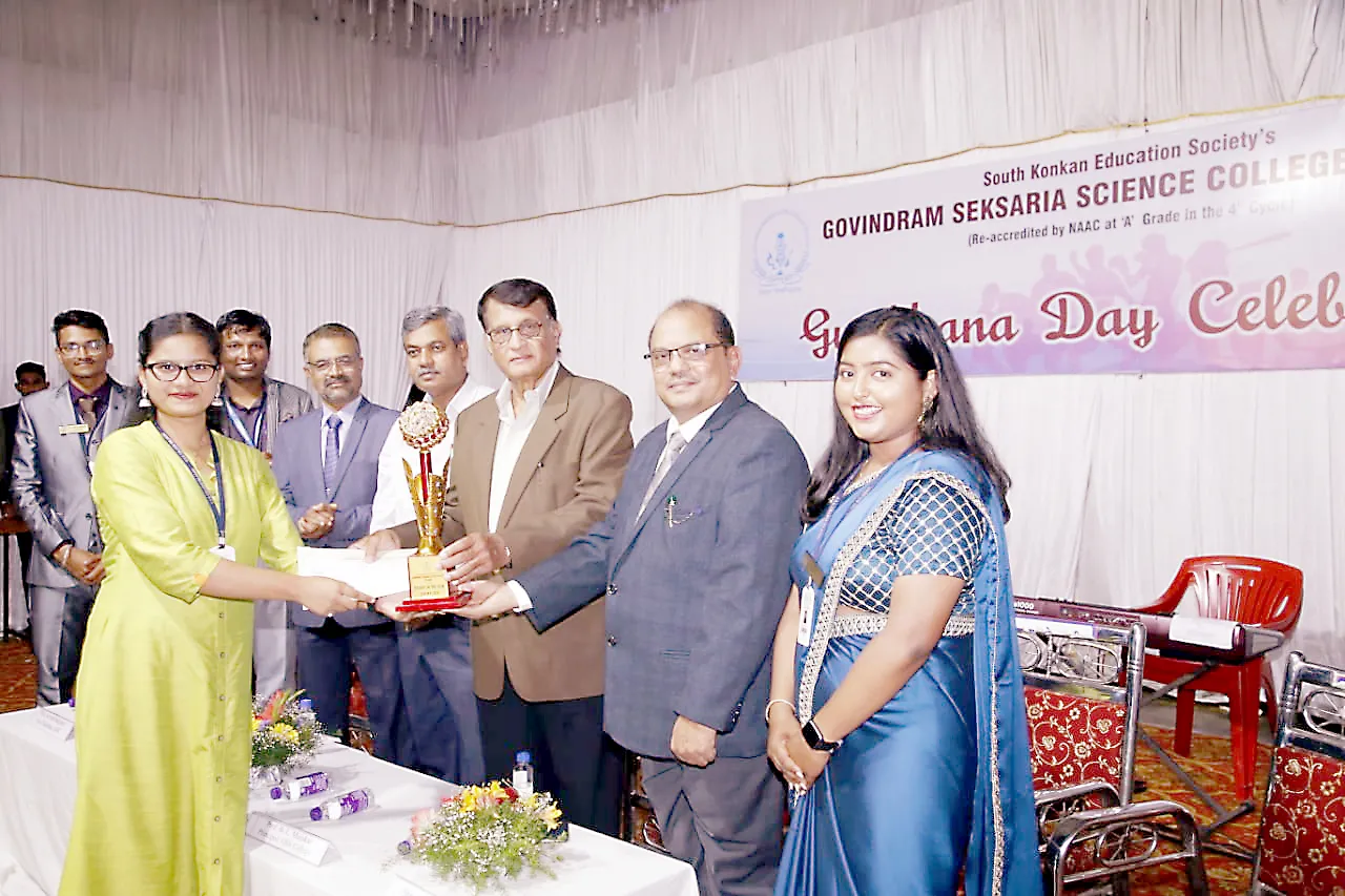 यावेळी गुणी विद्यार्थी, उत्कृष्ट खेळाडू तसेच विविध क्षेत्रात उल्लेखनीय कामगिरी केलेल्या विद्यार्थ्यांना गौरविण्यात आले. उकृष्ट विद्यार्थी म्हणून अंजली गावडे हिला चषक, प्रमाणपत्र व रोख पारितोषिक देण्यात आले. विद्यार्थी सचिव रोहन शेलार यांनी आभार मानले. याप्रसंगी क्रीडा शिक्षक प्रशांत मनकाळे, विद्यार्थी प्रतिनिधी वैष्णवी पाटील तसेच सर्व प्राध्यापक उपस्थित होते. सांस्कृतिक कार्यक्रमाने सांगता झाली.