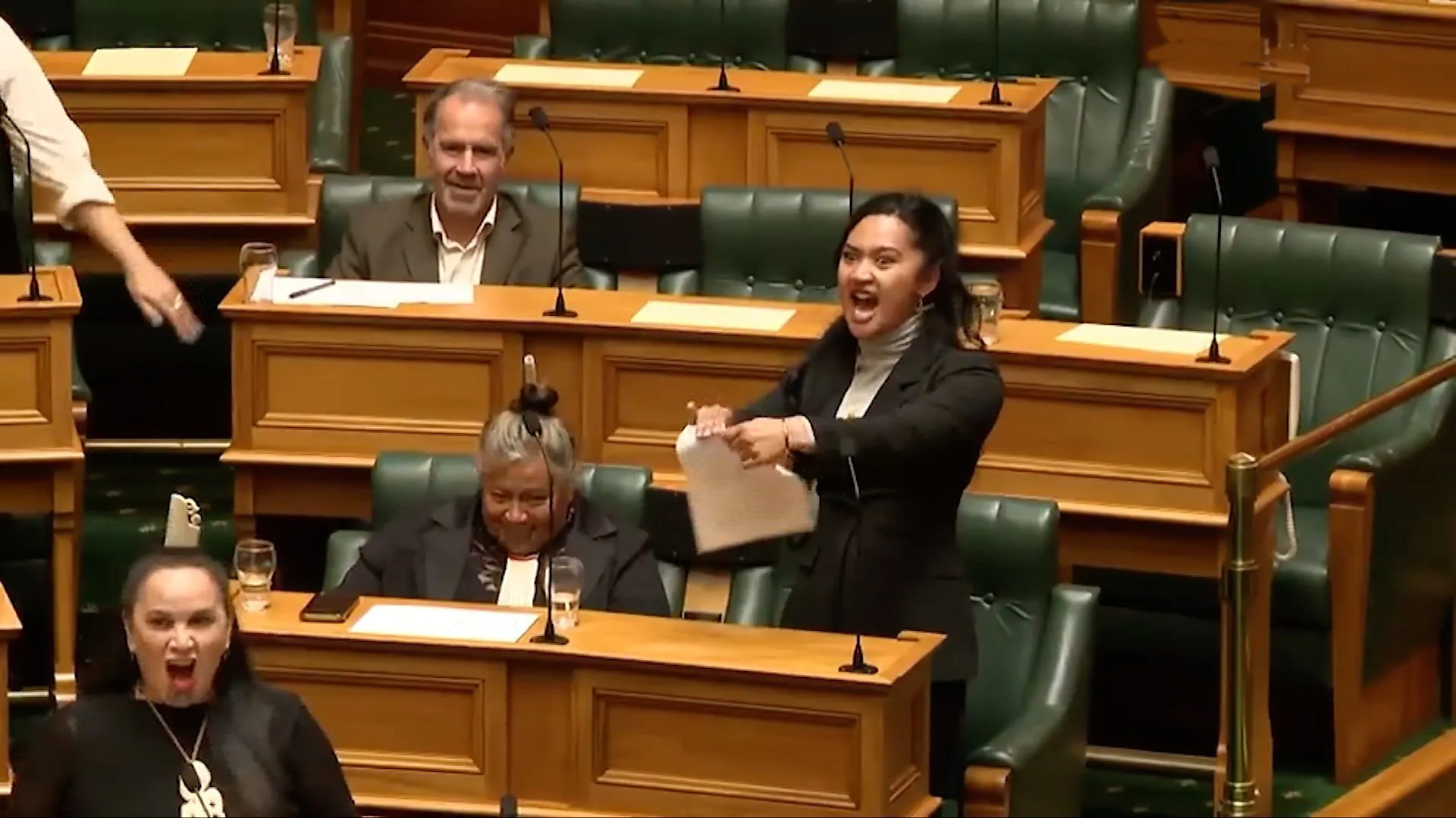 न्युझीलंडच्या संसदेत गुरुवारी वेगळाच प्रकार दिसून आला, तेथे एक अनोखे निदर्शन पाहण्यास मिळाले. संसदेतील सर्वात युवा खासदार हाना-रावहिती यांनी एका विधेयकाला विरोध करत सभागृहातच हाका नृत्य केले आहे. हे विधेयक ब्रिटन आण माओरी समुदायादरम्यान झालेल्या एका कराराशी संबंधित आहे.