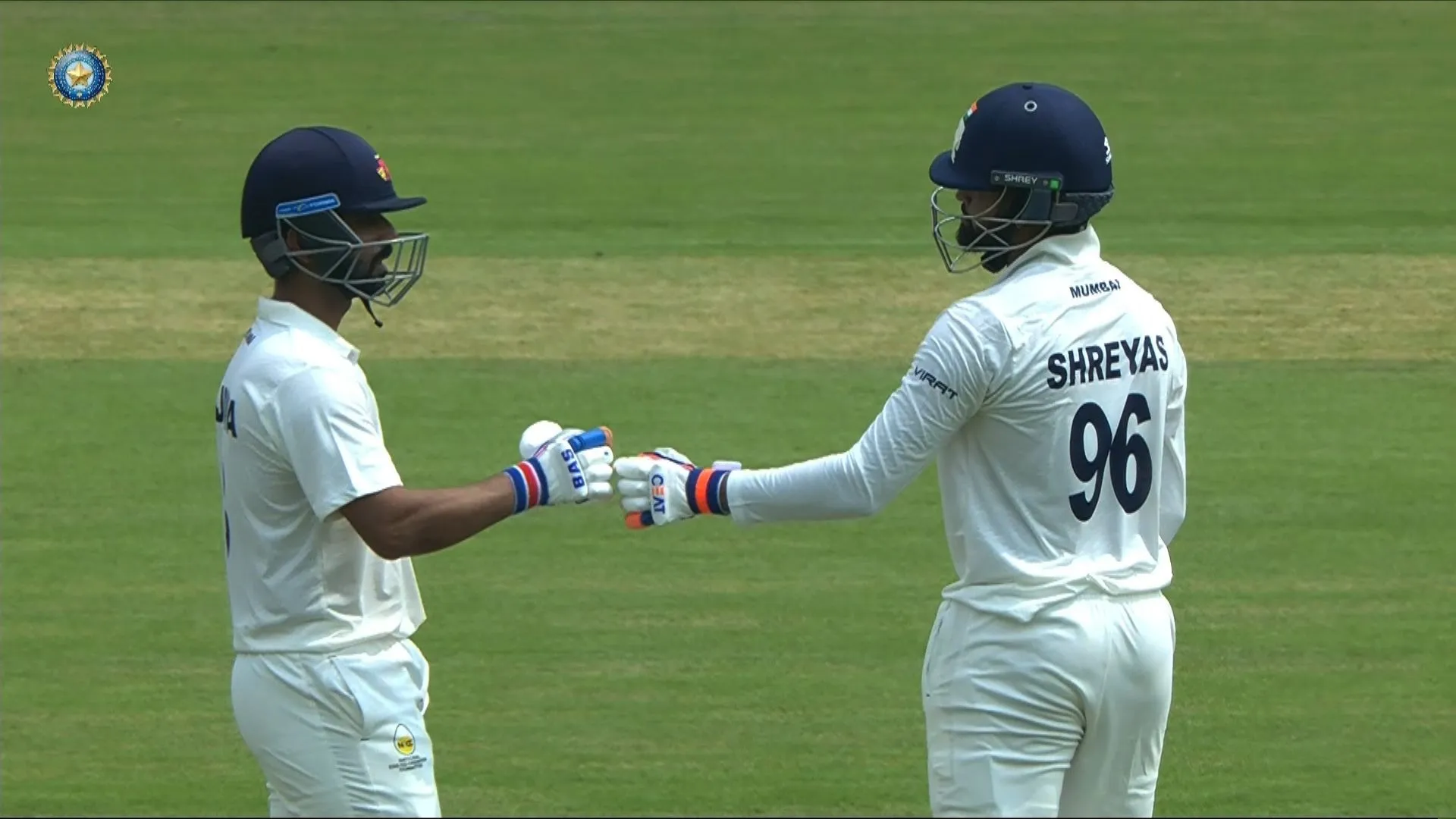 कर्णधार अजिंक्य रहाणे आणि श्रेयस अय्यर यानी चौथ्या गड्यासाठी 102 धावांची शतकी भागीदारी करत संघाचा डाव सावरला. अय्यरने 84 चेंडूत 2 षटकार आणि 6 चौकारांसह 57 धावा जमविल्या. यश दयालने अय्यरला झेलबाद केले. एका बाजुने कर्णधार रहाणे सावध फलंदाजी करत होता. त्याला सर्फराज खानकडून चांगली साथ मिळाली. या जोडीने चौथ्या गड्यासाठी अभेद्य 98 धावांची भागीदारी केली. अजिंक्य रहाणे 1 षटकार आणि 6 चौकारांसह 86 तर सर्फराज खान 6 चौकारांसह 54 धावावर खेळत आहेत. शेष भारतातर्फे मुकेश कुमारने 60 धावात 3 तर दयालने 46 धावात 1 गडीबाद केला.