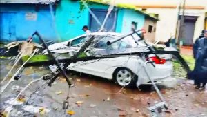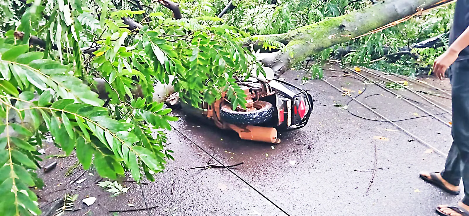 गुऊवारी झालेल्या जोरदार पावसावेळी मजगावच्या मुख्य रस्त्यावरील झाड दुचाकीवर आणि विद्युततारांवर कोसळले. यावेळी जवळच पार्किंग केलेल्या कारवरही विद्युतखांब कोसळला. यावेळी तेथे कोणीच नव्हते, त्यामुळे मोठा अनर्थ टळला आहे. कामगार कार्यालयापासून काही अंतरावर असलेले मोठे झाड दुचाकीवर कोसळले. याचबरोबर ते झाड विद्युततारांवरदेखील कोसळल्याने विद्युतखांब पार्किंग केलेल्या कारवर कोसळला. यावेळी मोठा आवाज झाल्याने काहीवेळ गोंधळ उडाला. मात्र तातडीने वीजपुरवठा खंडित करण्यात आल्याने सुदैवानेच मोठा अनर्थ टळला आहे. या घटनेमुळे परिसरात भीतीचे वातावरण पसरले आहे.