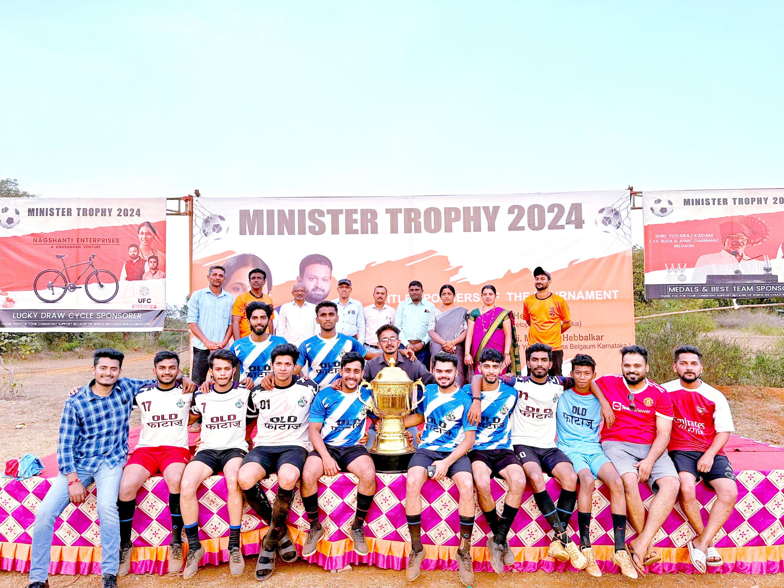 येथील वैकुंठधाम येथे पार पडलेल्या उचगाव फुटबॉल क्लब असोसिएशनच्यावतीने लक्ष्मीताई हेब्बाळकर ‘मिनिस्टर ट्रॉफी’ या फुटबॉल स्पर्धेचे मानकरी ओल्ड फाटाज यांनी पटकावून 35000 रुपये व ट्रॉफीचे मानकरी ठरले. तर द्वितीय क्रमांक भैरवनाथ फास्ट फॉरवर्ड यांनी 15000 रुपये व ट्रॉफी पटकाविण्याचा मान मिळविला. बुडाचे माजी अध्यक्ष युवराज कदम, उचगाव ग्रा. पं. अध्यक्षा मथुरा तेरसे, सदस्य जावेद जमादार, गायत्री ज्वेलर्सचे मालक राकेश बांदिवडेकर, सामाजिक कार्यकर्ते शशिकांत जाधव, सदस्या भारती जाधव व माधवराव राणे आणि नागशांती ग्रुप या सर्वांच्या हस्ते उपस्थित विजयी संघांना आणि वैयक्तिक विजेत्यांना ही पारितोषिके देऊन गौरविण्यात आले. नागशांती ग्रुप यांचेकडून सायकल लकी ड्रॉसाठी ठेवण्यात आली होती. या लकी ड्रॉचे मानकरी सुमित कल्लेहोळकर, कर्मवीर भाऊराव पाटील हायस्कूल गोजगे येथील इयत्ता आठवीच्या वर्गात शिकणाऱ्या या विद्यार्थ्याने मिळविली. यावेळी उत्कृष्ट संघांना मेडल्स युवराज कदम यांच्या हस्ते देण्यात आले. तसेच हॉटेल रेड स्टोन आणि गायत्री ज्वेलर्स यांच्यावतीने ट्रॉफी भेटीदाखल देण्यात आल्या. बाळकृष्ण तेरसे व मथुरा तेरसे यांच्याकडून खेळाडूंना जर्शी भेटीदाखल देण्यात आल्या. तर शशिकांत जाधव आणि भारती जाधव यांच्याकडून फुटबॉल स्पर्धेसाठी लागणारे किड्स भेटीदाखल देण्यात आले.