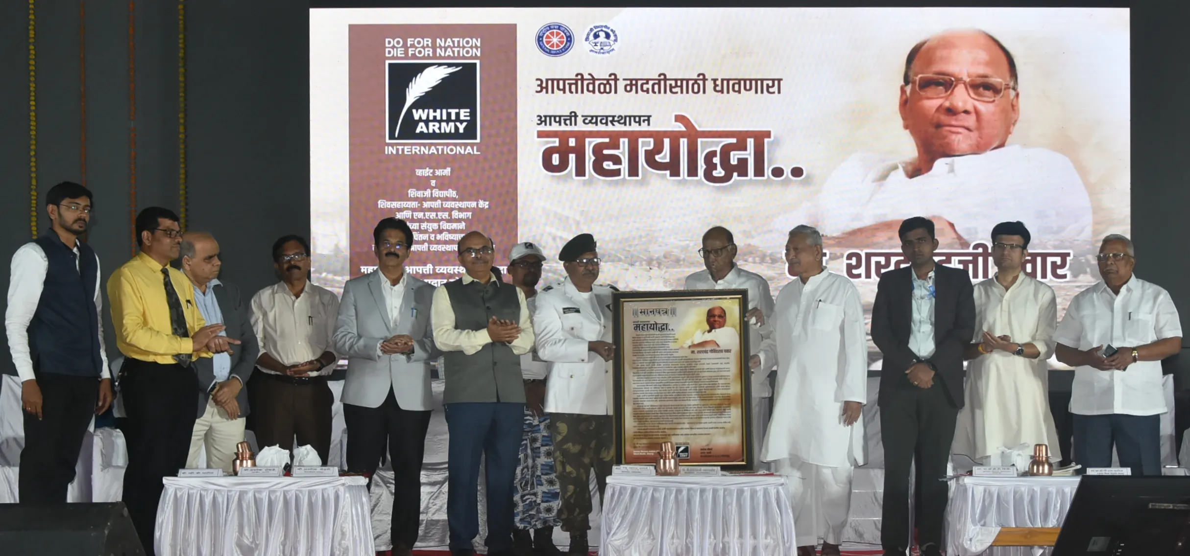 ज्येष्ठ नेते खासदार शरद पवार यांनी महाराष्ट्रासह संपूर्ण देशात आपत्ती काळात राबविलेल्या बचावकार्याबद्दल जीवन मुक्ती सेवा संस्था, व्हाईट आर्मी यांच्यावतीने आपत्ती व्यवस्थापन महायोद्धा पुरस्काराने सन्मानित करण्यात आले. खासदार शाहू छत्रपती यांच्या हस्ते शाल, श्रीफळ आणि मानपत्र देवून शरद पवार यांचा सत्कार करण्यात आला. शिवाजी विद्यापीठाच्या राजमाता जिजाउसाहेब सभागृहामध्ये हा सत्कार सोहळा पार पडला. यावेळी जिल्हाधिकारी अमोल येडगे, शाहू कारखान्याचे अध्यक्ष समरजित घाटगे, सरोज पाटील, शिवाजी विद्यापीठाचे कुलगुरु डॉ. डी. टी. शिर्के, प्र–कुलगुरु पी. एस. पाटील, रजिस्टार डॉ. व्ही. एन. शिंदे, व्हाईट आर्मीचे अशोक रोकडे, राष्ट्रवादीचे व्ही. बी. पाटील प्रमुख उपस्थित होते.