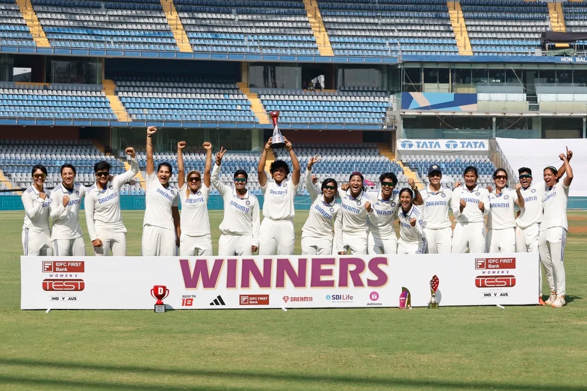 हरमनप्रीत कौरच्या नेतृत्वाखालील भारतीय महिला संघाने ऑस्ट्रेलियाविरुद्ध पहिल्यांदाच कसोटी जिंकत ऐतिहासिक कामगिरी केली आहे. वानखेडे स्टेडियमवर झालेल्या एकमेव कसोटीत भारतीय महिलांनी ऑस्ट्रेलियाचा 8 गडी राखून पराभव केला. विशेष म्हणजे, 2014 नंतर प्रथमच ऑस्ट्रेलियन महिला संघाला कसोटीमध्ये हार पत्करावी लागली आहे. दरम्यान, सामन्यात सात बळी घेणाऱ्या स्नेह राणाला सामनावीर पुरस्काराने गौरवण्यात आले.