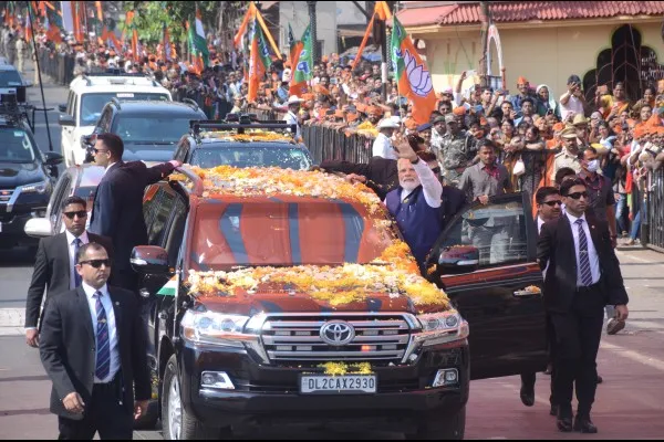शिमोगा येथून दुपारी 2.50 वाजता नरेंद्र मोदी यांचे बेळगावात आगमन झाले. त्यानंतर एपीएमसी पासूनच त्यांनी रोडशोला सुरूवात केली. काळ्यारंगाच्या वाहनांमधून मोदी उभे राहून साऱ्यांना हात उंचावून पुढे जात होते. मोदी जसे पुढे जात होते तसे त्यांचे चाहते देखील पुढे पुढे जात होते. महिलांसह नागरिकांनीही मोदी दाखल होताच एकच जयघोष केला. शहराच्या प्रत्येक चौकामध्ये सारेच पुष्पवृष्टी करुन स्वागत करण्यात आले. सर्वत्र कडेकोट बंदोबस्तात ते पुढे पुढे जात होते. रक्षकही त्यांच्या वाहनांसोबत धावत होते.