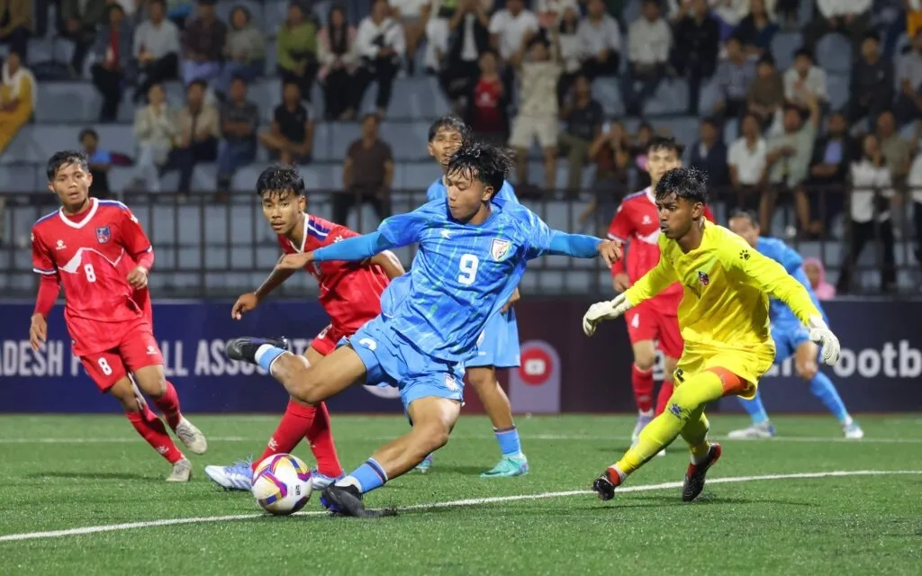 दोन्ही संघांनी उपांत्य फेरी याआधीच निश्चित केली होती. त्यामुळे गटात अग्रस्थान कोण मिळविणार याबाबत या सामन्यात उत्सुकता होती. दोन्ही संघ अग्रस्थान पटकावण्यासाठी कोणतीही तडजोड करण्यास तयार नसल्याचे सामन्यात दिसून आले. मात्र गोल करण्यास सुरुवात झाल्यानंतर भारताने स्वत:चे वर्चस्व सिद्ध केले. मलेम्नगाम्बा सिंगने डाव्या पायाने मारलेला चेंडू काही जणांनी हेडिंग केल्यानंतर डाव्या बगलेतून रोहेनकडे क्रॉस पास आला. त्याने लगेचच चेंडू स्लाईड करीत नेपाळ गोलरक्षक भक्त बहादुर पेरियारला हुलकावणी देत 28 व्या मिनिटाला गोल नोंदवला. एका मिनिटानंतर ओमंगते ही आघाडी 2-0 अशी केली. त्याने डॅनीकडून मिळालेल्या पासवर त्याने साईडफूटने टॉप कॉर्नरवर फटका मारत हा गोल केला.