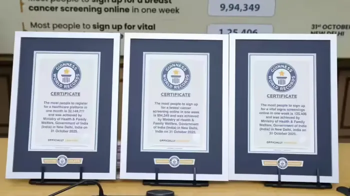 केंद्रीय आरोग्यमंत्री न•ा यांनी सोशल मीडिया प्लॅटफॉर्म ‘एक्स’वर एक पोस्ट करून आरोग्य मंत्रालयाला देण्यात आलेल्या तीन गिनीज वर्ल्ड रेकॉर्ड्सची माहिती दिली. मंत्रालयाच्या म्हणण्यानुसार, पहिला पुरस्कार एका महिन्यात आरोग्य व्यासपीठावर नोंदणी केलेल्या सर्वाधिक लोकांसाठी (3.21 कोटी), दुसरा पुरस्कार एका आठवड्यात ऑनलाइन स्तनाच्या कर्करोग तपासणीसाठी साइन अप केलेल्या सर्वाधिक लोकांसाठी (9.94 लाख) आणि तिसरा पुरस्कार एका आठवड्यात ऑनलाइन महत्वाच्या लक्षणांच्या तपासणीसाठी साइन अप केलेल्या सर्वाधिक लोकांसाठी (राज्य पातळीवर 1.25 लाख) आहे.