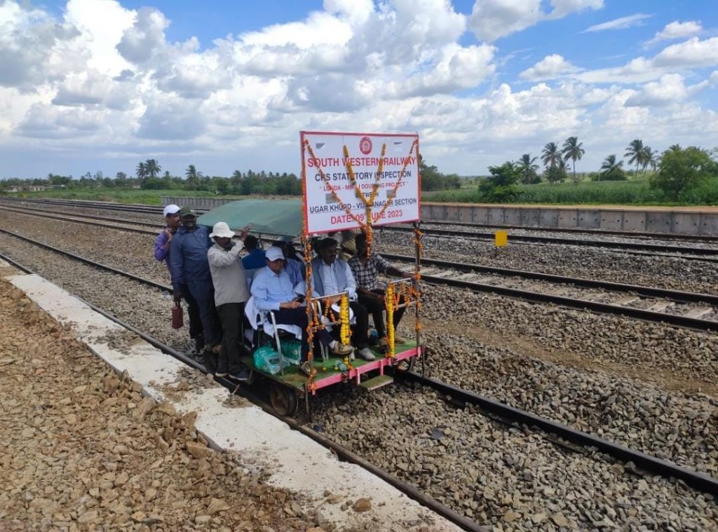 बेळगाव : लोंढा-मिरज या रेल्वेमार्गावरील उगारखुर्द ते विजयनगर या दरम्यान नव्याने रेल्वेरुळ घालण्यात आला आहे. या रेल्वेमार्गाची पाहणी शुक्रवारी नैर्त्रुत्य रेल्वेच्या अधिकाऱ्यांनी केली. ट्रॉलीमधून या दोन्ही रेल्वेस्थानकामधील रेल्वे मार्गाची पाहणी करून त्यानंतर रेल्वे इंजिन धावले. उगार खुर्द-विजयनगर या रेल्वेमार्गाचे नुकतेच दुपदरीकरण करण्यात आले. नवा रेल्वेरुळ वाहतुकीसाठी योग्य आहे का? याची तपासणी करण्यासाठी नैर्त्रुत्य रेल्वेच्या अधिकाऱ्यांनी सर्वेक्षण केले. नैर्त्रुत्य रेल्वेचे मुख्य अभियंता मुरलीकृष्णा व मध्य रेल्वेच्या पुणे विभागाचे अभियंता हर्ष खरे यांनी एकत्रितरित्या या रेल्वेमार्गाची पाहणी केली. रेल्वेरुळ वाहतुकीसाठी योग्य असल्याचा अहवाल आल्यानंतर या मार्गावरून रेल्वे इंजिन यशस्वीरित्या धावले. त्यामुळे लवकरच हा मार्ग प्रवासी रेल्वे वाहतुकीसाठी खुला केला जाणार आहे.