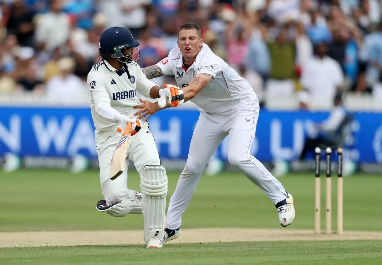 कसोटीच्या पाचव्या दिवशी लॉर्ड्सच्या मैदानात पुन्हा एकदा हाय व्होल्टेज ड्रामा पाहायला मिळाला. रवींद्र जडेजा आणि ब्रायडन कार्से यांच्यात धाव घेताना शाब्दिक वाद झाला आणि क्षणभर मैदानावरचे वातावरण तापले. ही घटना कार्सेच्या ओव्हरमध्ये घडली. कार्सेच्या षटकात रवींद्र जडेजा ऑफ साईडवर शॉट मारून धावण्यासाठी धावला. यादरम्यान, जडेजा चेंडू पाहत धावत होता आणि कार्से त्याच्यामध्ये आला. दोघेही एकमेकांना धडकले. यावेळी कार्से पुन्हा जडेजाला काहीतरी म्हणाला. यानंतर, जडेजा संतापल्याचे पहायला मिळाले. या प्रसंगानंतर इंग्लंडचा कर्णधार बेन स्टोक्सने तत्काळ हस्तक्षेप करत दोघांनाही शांत केले आणि सामना पुन्हा सुरळीत सुरू झाला.