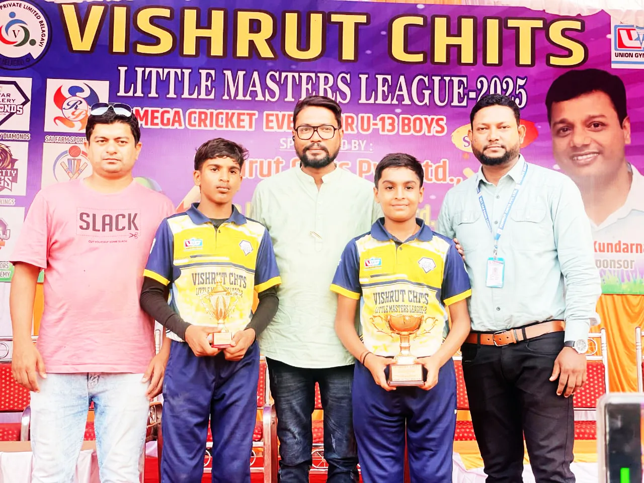 बेळगाव : युनियन जिमखाना आयोजित चंदन कुंदरनाड पुरस्कृत विश्रुत चिटस लिटिल मास्टर्स लीग क्रिकेट स्पर्धेत मंगळवारी झालेल्या सामन्यात जेवर गॅलरी डायमंड संघाने साई फार्म स्पोर्ट्स क्लब संघाचा 33 धावांनी पराभव करत सलग दुसरा विजय मिळविला. सकाळी साईराज वॉरियर्स पालेकर अकादमी विरुद्ध शार्प इंटरप्राईजेस यांच्यातील सामना सोमवारी रात्री झालेल्या पावसामुळे रद्द करण्यात आला. प्रथम फलंदाजी करताना जेवर गॅलरी डायमंड संघाने 25 षटकात 8 गडी बाद 139 धावा केल्या. सचिन तलवारने 71 चेंडूत 5 चौकारांसह 66, आलोक जे.ने 1 चौकार 1 षटकारसह 25, विवान भूसदने 22 धावा केल्या. साई फार्म स्पोर्ट्सतर्फे सुप्रीत बुरुडने 2 तर निखिल राठोड व साईश रायकर यांनी प्रत्येकी एक गडी बाद केला. उत्तरा दाखल साई फार्म स्पोर्ट्स क्लबचा डाव 22.4 षटकात 106 धावात आटोपला. प्रणव जे. 4 चौकारांसह 29, साईराज पोरवाल 19, सुहास हिरेकोडी 17 तर समर्थ चेन्नईगिरी 15 धावा केल्या. जेवर गॅलरी डायमंडतर्फे विनायक एन.ने 21 धावत 4, विवान भूसदने 3 तर अम्मार पठाणने 1 गडी बाद केला. सामनावीर विवान भूसद तर इम्पॅक्ट खेळाडू सचिन तलवार यांना प्रमुख पाहुणे प्रमोद कित्तूर आशिष चव्हाण व मोहम्मद ताहीर सराफ यांच्या हस्ते सन्मानित करण्यात आले.