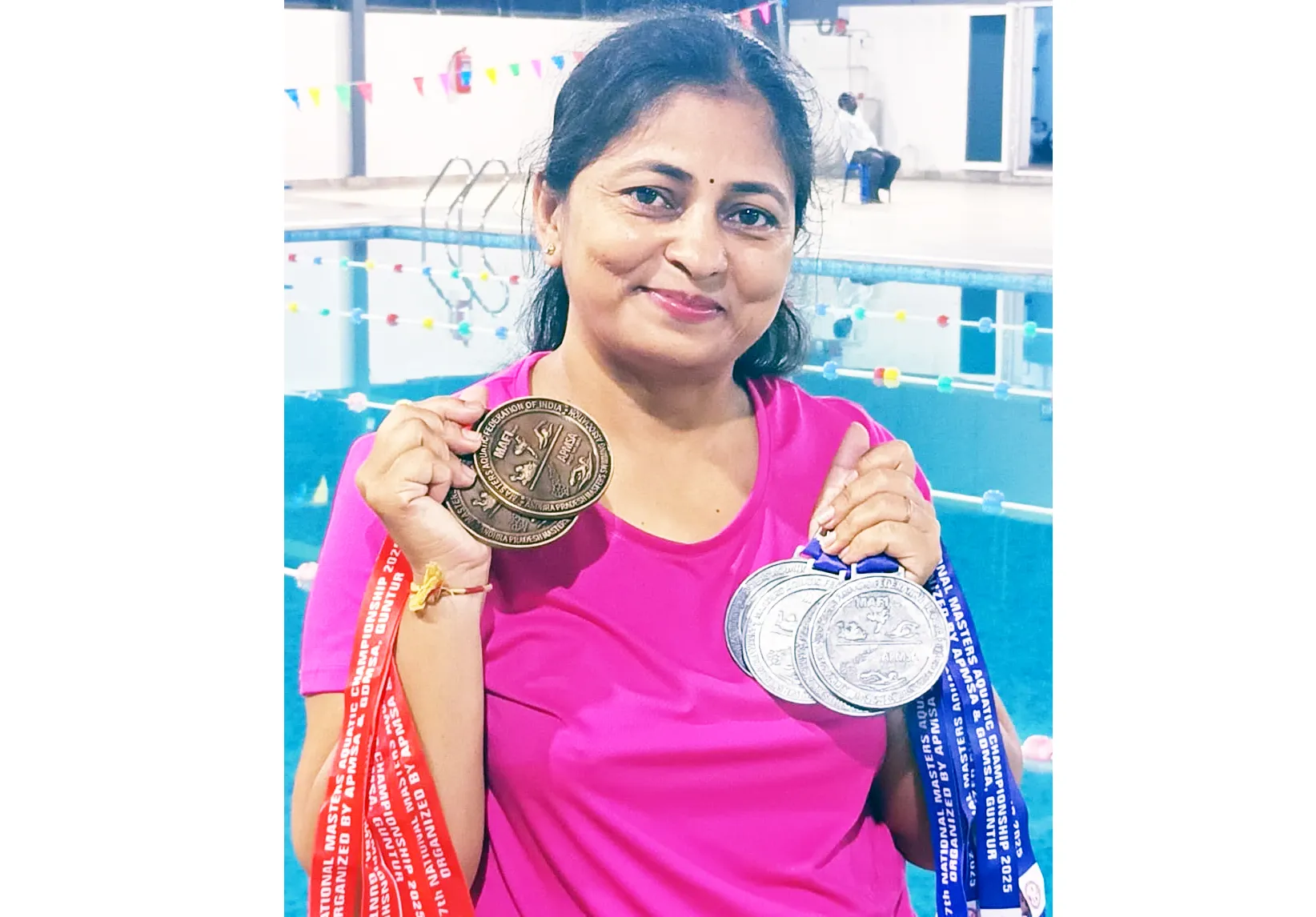 बेळगाव : आंध्रप्रदेशमधील गुंटूर येथे झालेल्या मेहबूब शमशेर खान यांच्या स्मरणार्थ 7 व्या राष्ट्रीय मास्टर अॅक्वेटीक जलतरण स्पर्धेत बेळगावच्या सरकारी वैद्यकीय अधिकारी ज्योती होसट्टीने 3 सुवर्ण, 3 रौप्यपदकास घवघवीत यश संपादन केले. या स्पर्धेत कर्नाटकाचे प्रतिनिधीत्व करणाऱ्या बेळगावच्या ज्योती होसट्टीने 25 व 50 मी. बॅकस्टोक, 50 मी. फ्रीस्टाईलमध्ये एकूण तीन सुवर्ण तर 25 मी. बटरफ्लॉय 4×100 फ्रीस्टाईल रिले व 4×100 मी. मिडले स्पर्धेत एकूण तीन रौप्यपदके पटकाविली. मान्यवरांच्या हस्ते तिला पदके व प्रमाणपत्र देऊन गौरविण्यात आले. ज्योती होसट्टीने महिलांच्या 45 ते 49 वर्षे वयोगटात महिलांच्या विभागात भाग घेतला होता.